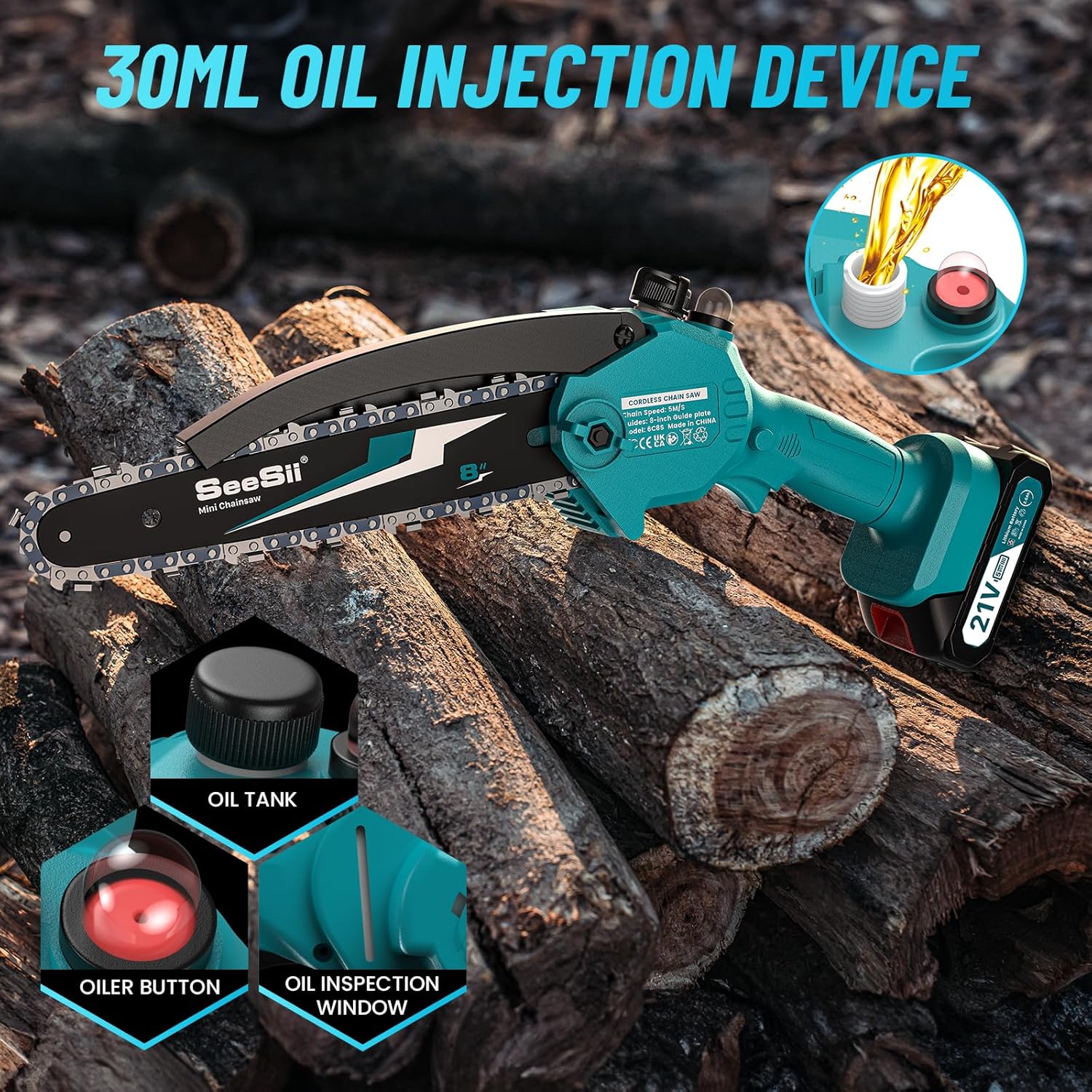 - Automatic Oiling System: Eliminate the hassle of manual lubrication with the SEESII handheld chainsaw's integrated auto oiler system. Simply fill the oil tank, press the oiler button, and let the chainsaw automatically apply oil to the chain, ensuring smooth and efficient cutting. Enjoy the convenience of effortless maintenance and focus more on your cutting tasks with SEESII’s self-lubricating system