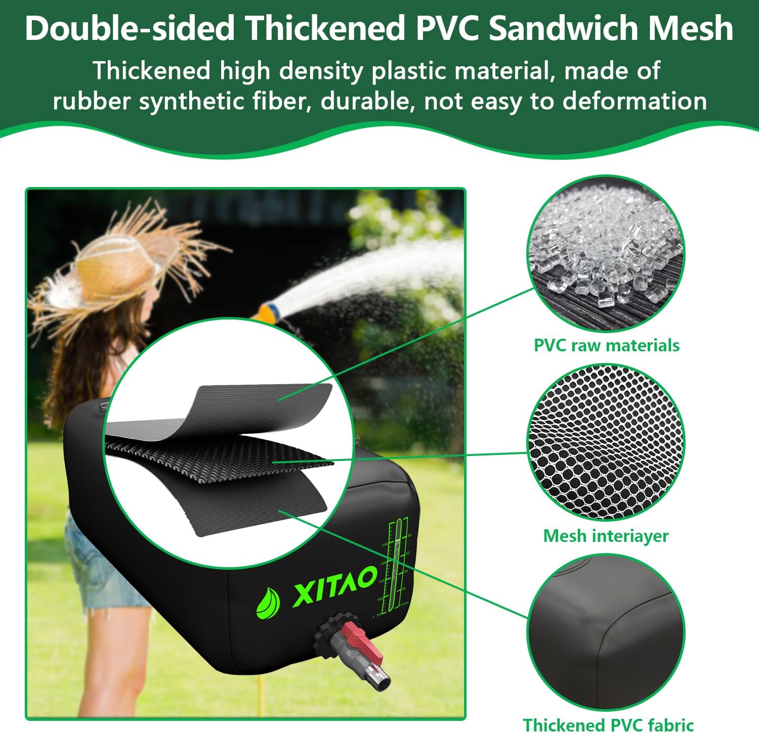 - 【Thicken 1300D PVC Materials】Made from premium thicken 1300D PVC material, this rain barrel is super strong and durable. It has unique properties such as rainproof, fireproof, waterproof, tearing force, non cracking, wear-resistant, stretch resistance and UV resistant, antistatic, and easy to form. Water storage containers can be used repeatedly for many years. This material is also eco-friendly safe, non-toxic and odorless.