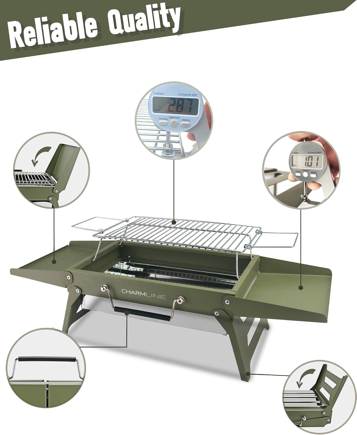 Charmline 14x9inch Small Foldable Portable Charcoal Grill, Compact Portable Grill for Outdoor, Charcoal Grills for Camping, Picnics, Gardens and Beach Parties, Liftable Grilling Net, Green