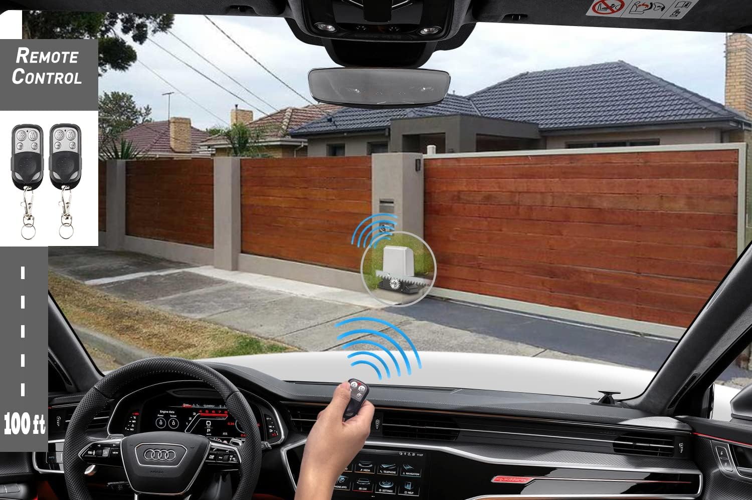 - 🔩【Smart Remote Control & Auto-Close】- Includes 2 remote controls (12V 27A battery included) with a 100ft operating range and the ability to store up to 40 remote codes, perfect for multiple users. The auto-close function can be set to 5s, 10s, or 20s, providing added security and convenience. For advanced functionality, it supports an optional Wi-Fi module (sold separately), enabling app-based control from anywhere.
