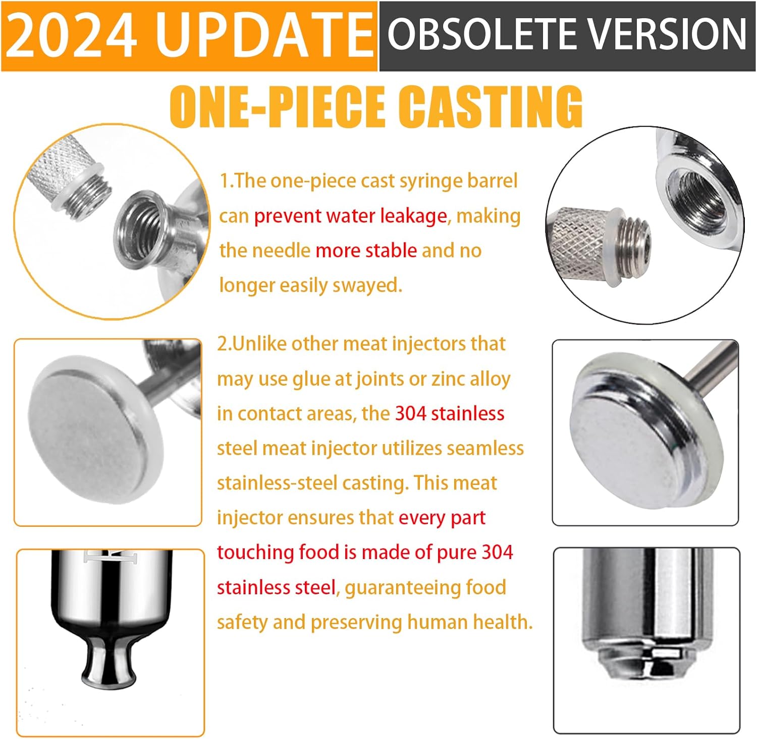 - [One-piece Casting] - Unlike other meat injectors that may use glue at joints or zinc alloy in contact areas, the 304 stainless steel meat injector utilizes seamless stainless-steel casting. This meat injector ensures that every part touching food is made of pure 304 stainless steel, guaranteeing food safety and preserving human health. In addition, the one-piece cast syringe barrel can prevent water leakage, making the needle more stable and no longer easily swayed. This makes our meat injector superior to others in the market.