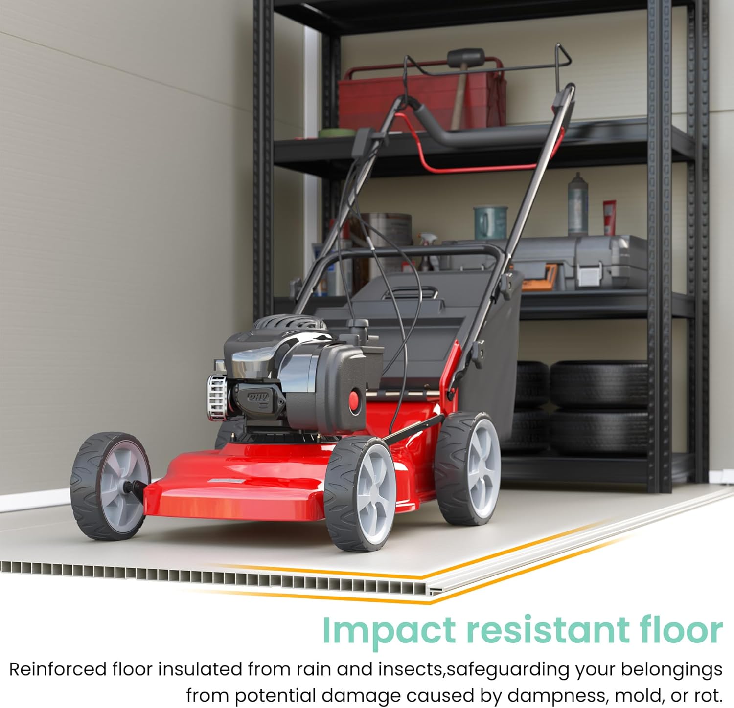 - RECYCLABLE RESIN MATERIAL: Our storage shed is crafted with 12 MM premium polypropylene resin plastic, which is recyclable. Resin shed is corrosion-resistant, waterproof, rustproof and with UV protection for more than 8000 hours, less bending and puncturing, worry-free for use in all weather conditions. It can be used daily for five years without fading