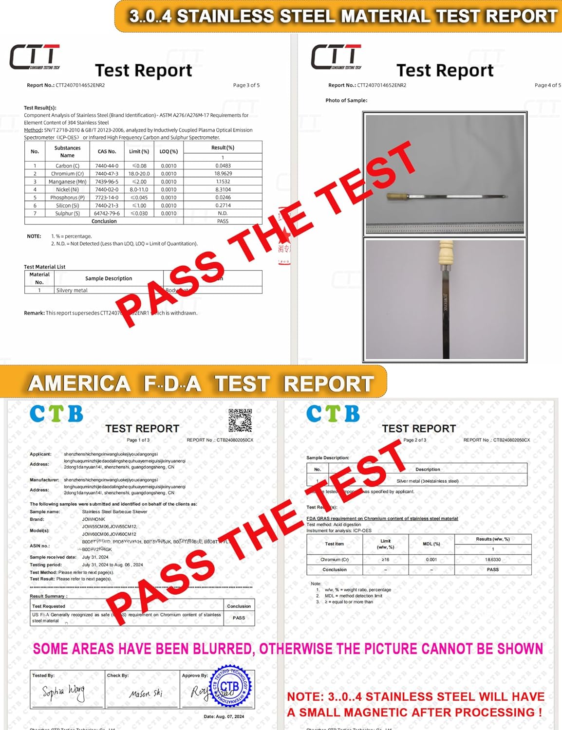 - 【304 STAINLESS STEEL HAS WEAK MAGNETISM】304 stainless steel may have weak magnetism because during the processing and forging process of the product, a small amount of austenite is converted into martensite, so 304 stainless steel may have a little magnetism,which is a normal phenomenon.We have America F..D..A test report and 304 stainless steel material test report, you can buy and use securely.