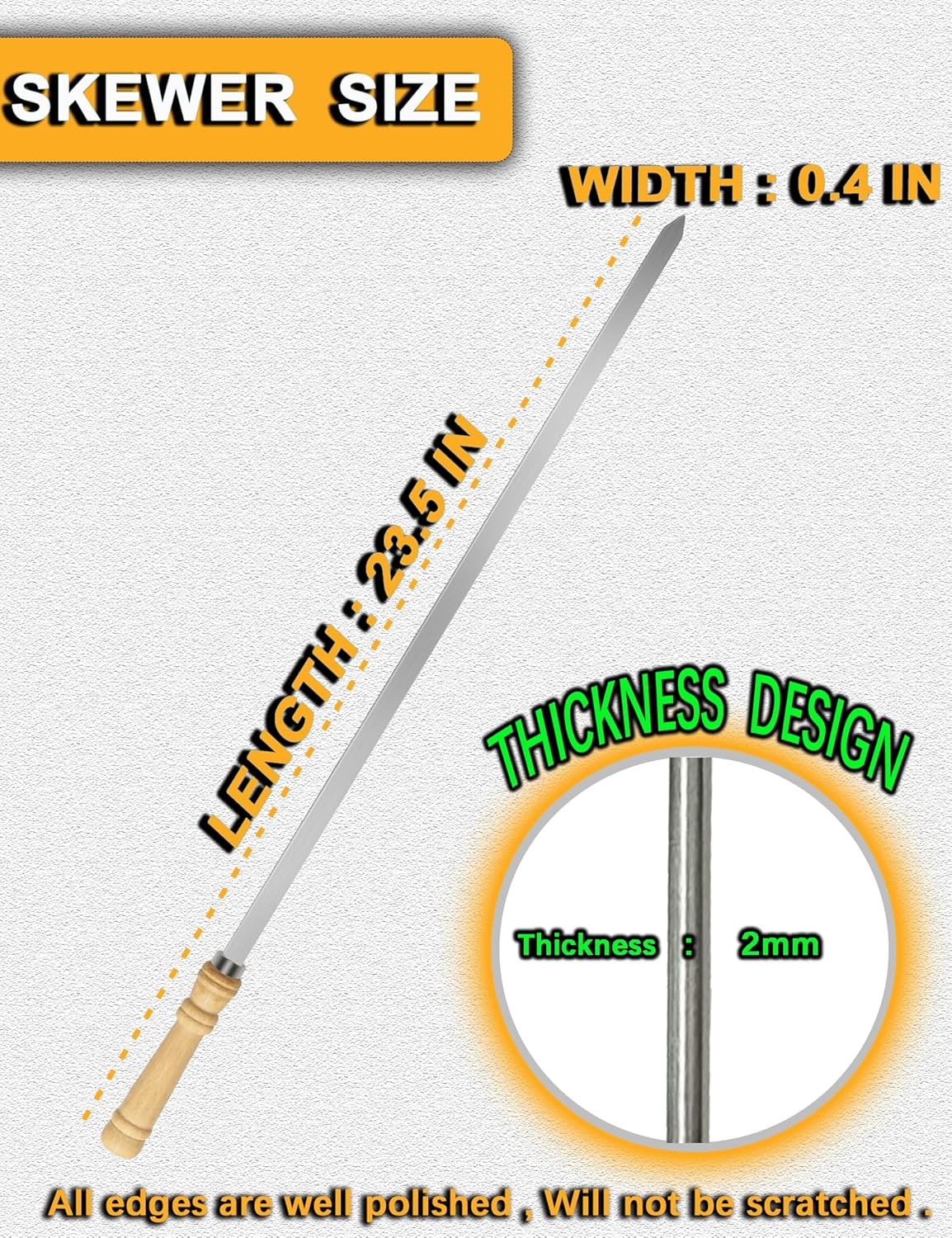 - 【FOOD GRADE 304 STAINLESS STEEL】JOWHONK BBQ skewers for grilling are 23.5 inches long,0.4 in width,0.07 in thickness. Our wooden handle flat metal skewers for kabobs are made of premium 304 stainless steel, Ensuring non-rust long time durability, Heat resistant and non-poisonous,Harder than other stainless steel and iron.It's safety for children.Our Stainless steel Barbecue skewers are reusable. The BBQ kabob skewers surface is smooth that grilled food residue won't get stuck onto the kabob skewer blade.