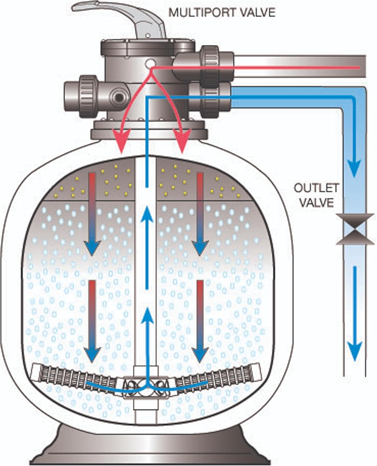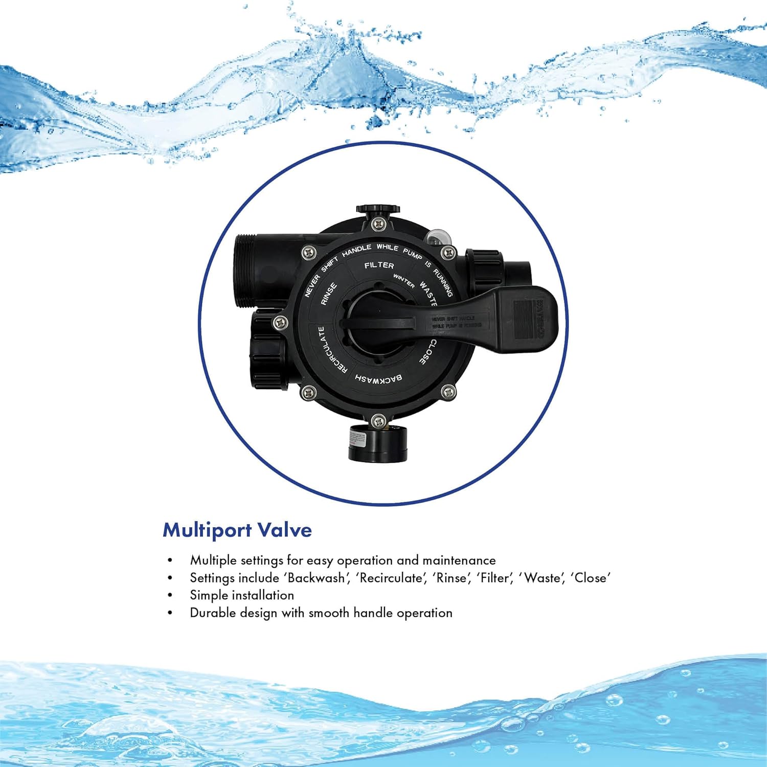 - Multiport Valve with 6 Modes: Quickly adjust operation with a 6-way top-mounted valve: Filter, Backwash, Rinse, Recirculate, Waste, and Close for total flow control.