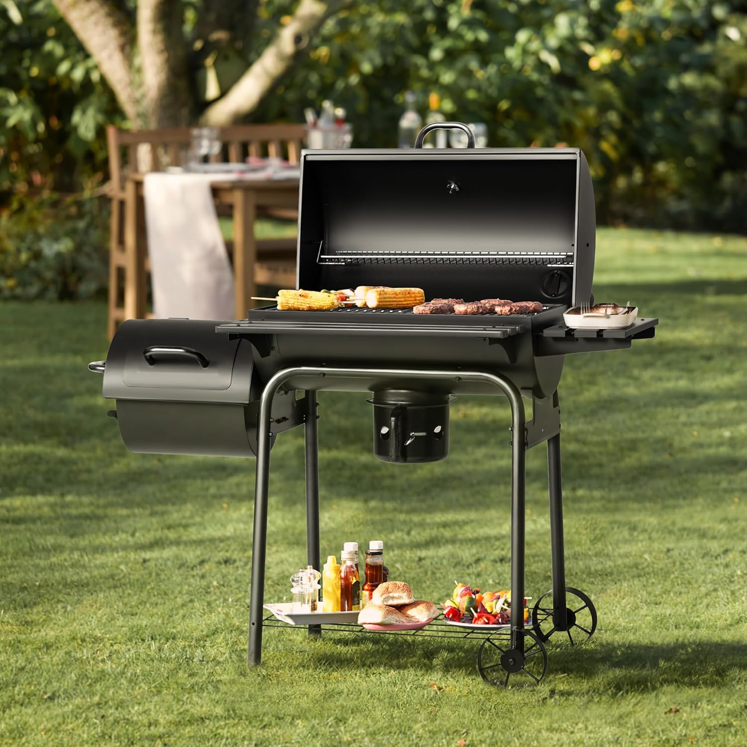 - [ All-around Experience ]: The double iron grill can be used separately for smoking and wood charcoal grilling to maximize the potential of your food. Two side dividers and an additional bottom shelf are provided to maximize usage, while two rolling wheels make it easy to move the grill around