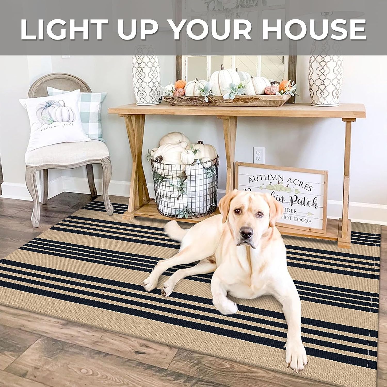 - Easy to Clean: This tan and black striped rug is simple to maintain with machine wash or vacuuming to remove dirt. The rug is sturdy and can be tumble dried on low. Keep your door rug fresh and clean with minimal effort. NOTE: Cotton rugs normally shrink slightly after washing
