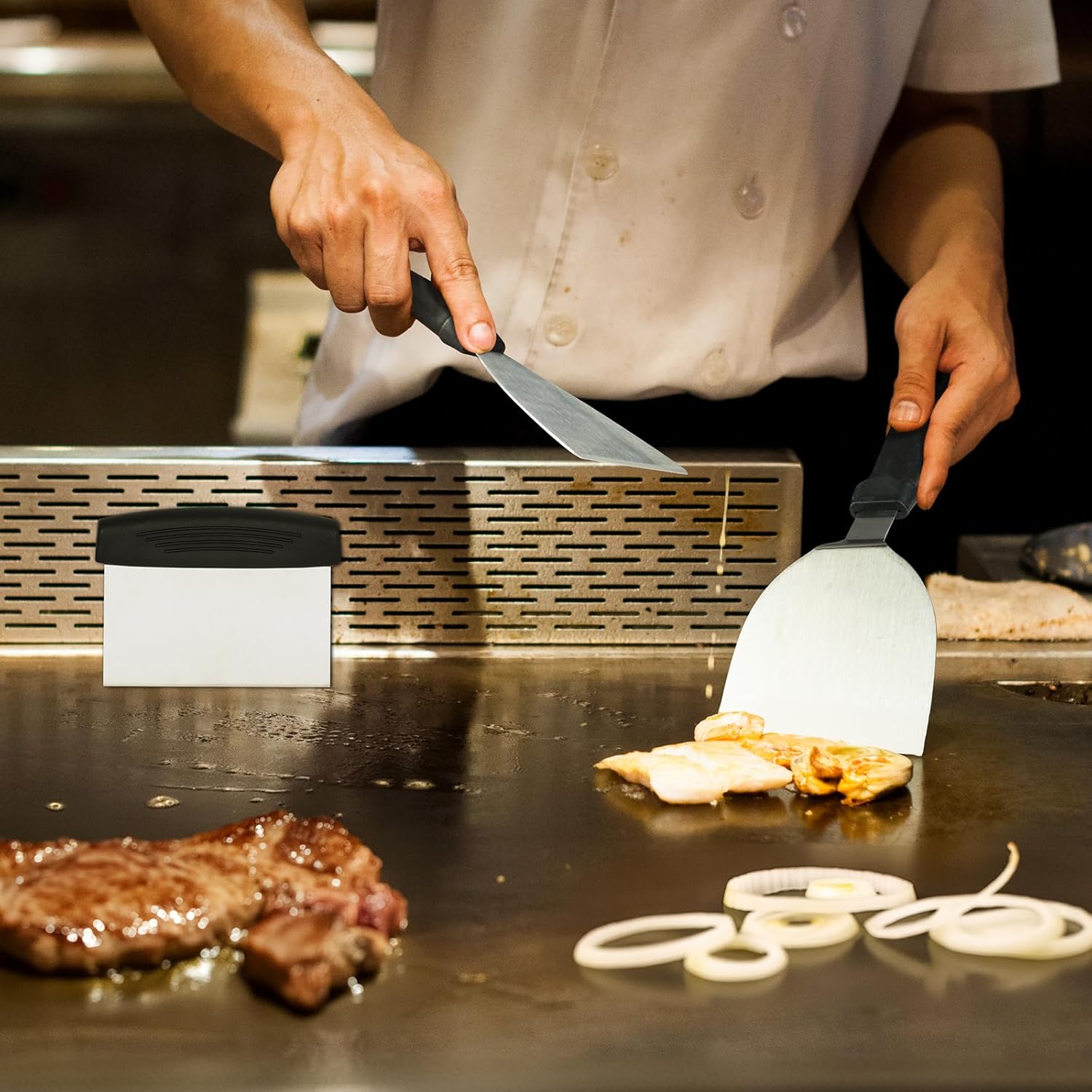 - 【Essential Griddle Accessories Kit】Designed for the ultimate griddle chef, our comprehensive set includes a scraper, spatulas, and oil bottles - indispensable tools for all griddle tasks. Includes scraper, spatulas, oil bottles, & 12.6” basting cover. Grill press ensures even searing. Set streamlines kitchen tasks, enhances grilling. Covers all from burger flips to meat basting, making meal prep effortless. Elevate your grilling with this must-have kit.