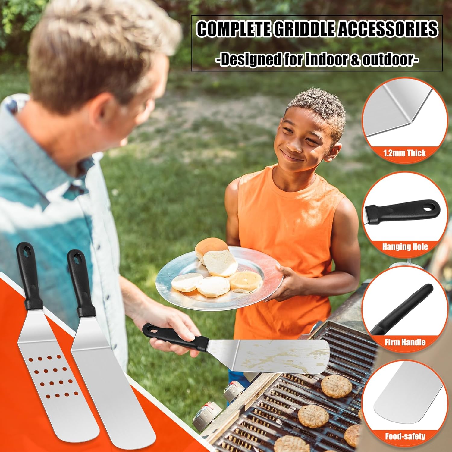 - 【Upgrated Professional Barbecue Tools Set】The Griddle Accessories Set has all the grill tools you need. It includes 1* Long Griddle Spatula, 1* Long Slotted Spatula, 1*Large Gurger Turner, 1*Griddle Chopper, 1*Griddle Spatula, 1*Slant Edge Scraper, 2*Basting Cover, 1*Griddle Press, 1*Carry Bag, 1*Long Grill Tong, 1*Basting Brush, 2* Squeeze Bottle, 1*Grill Thermometer, 1*Meat Knife, 1*Cleaning Brush, 2*Spice Shakers,2* Egg Rings,4* Corn Fork,10* Hanging Hooks.
