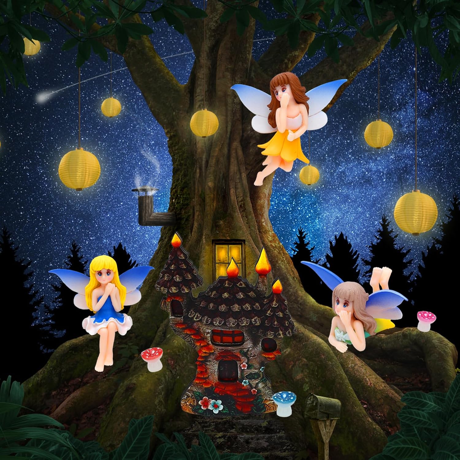- What you get: a fairy door, 4 pieces of fairy figurines, 6 pieces of mushrooms, a good combination for garden decorations. You create a tiny treehouse for your fairy friends using our fairy door kit. This fairy garden kit for outside is perfectly sized for bringing your fairy garden dreams to life