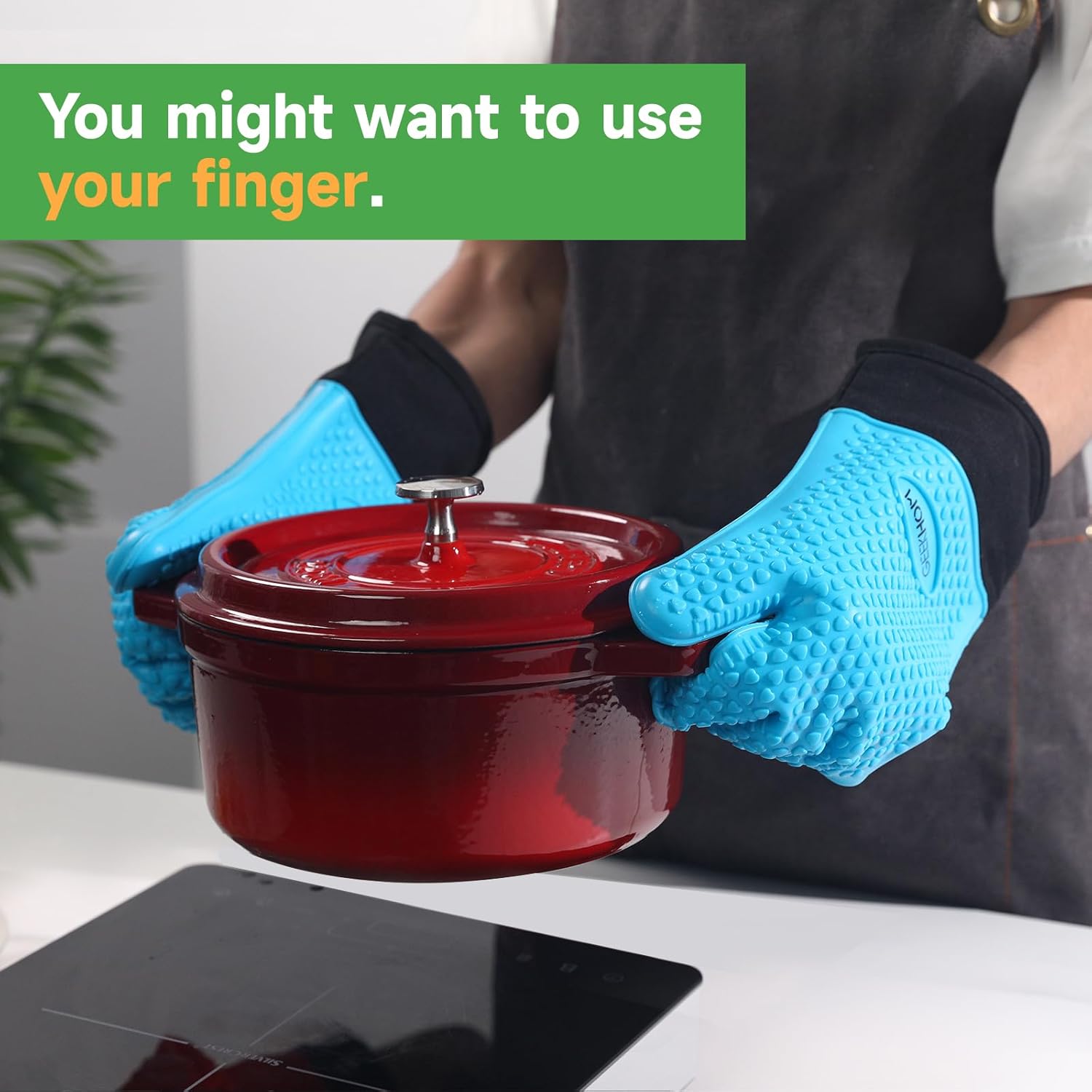 - Effortless Cleanup, Smarter Kitchen Flow: Waterproof silicone repels hot grease and marinade spills, while dishwasher-safe design erases stains in minutes; Hang the oven gloves compactly with the built-in loop—ideal for small kitchen spaces or tossing into camping gear without bulk