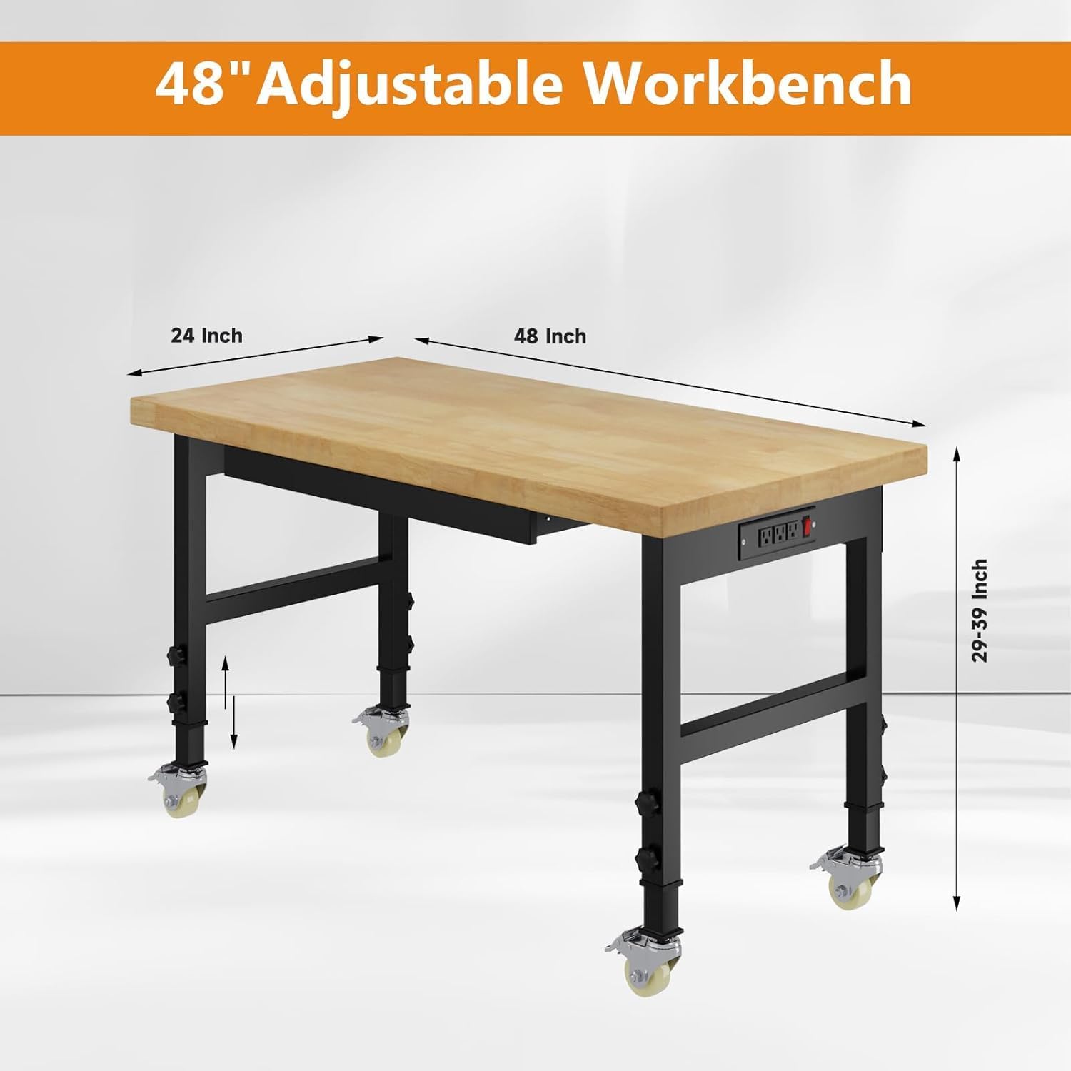 48" Work Bench with Drawers, Adjustable Height Workbench with Wheels, Heavy-Duty Work Table with Power Outlets, 2000 LBS Capacity Workstation for Garage, Workshop, Office, Home