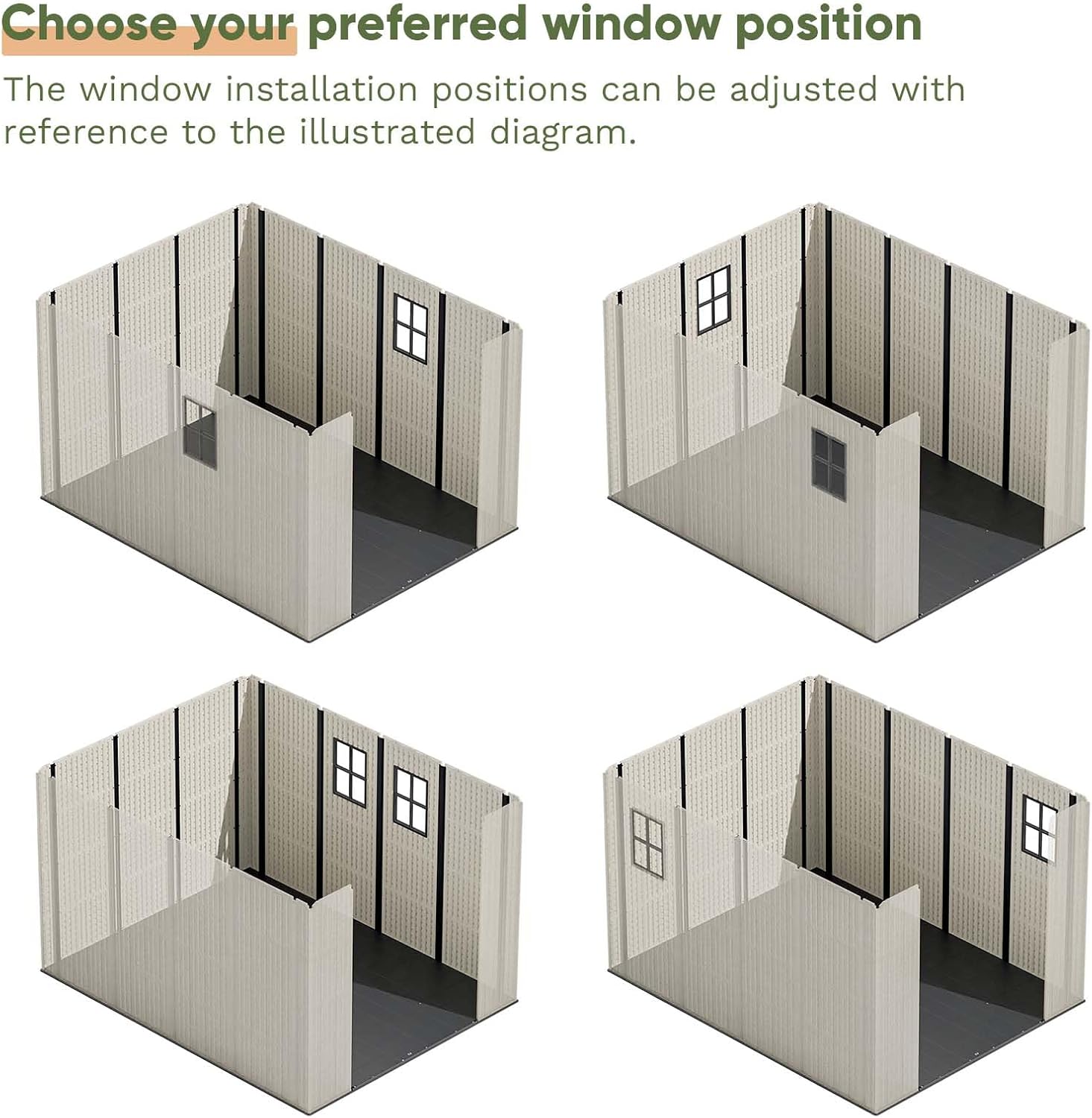 - Window design: Lets in natural light, reducing the need for extra lighting;Provides a pleasant view;Offers added security with a view of the shed's contents.And the position of the window can be adjusted according to your needs with the wall panel