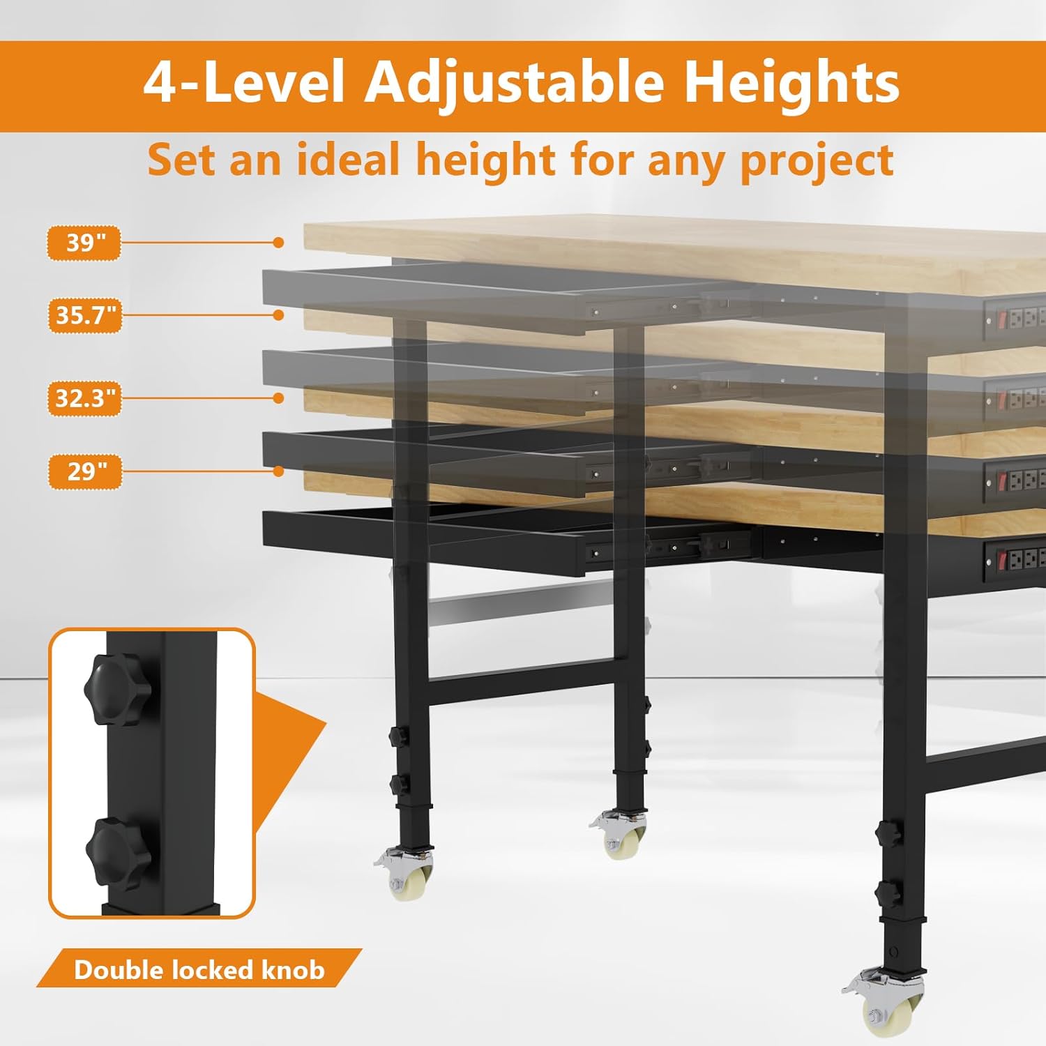 - Adjustable Height: This adjustable workbench features an easily adjustable height mechanism, allowing you to set the table height between 29" and 39". This flexibility ensures ergonomic comfort, whether youβre sitting or standing, and can be quickly adapted for different users and tasks, enhancing overall productivity and reducing strain during extended work periods.