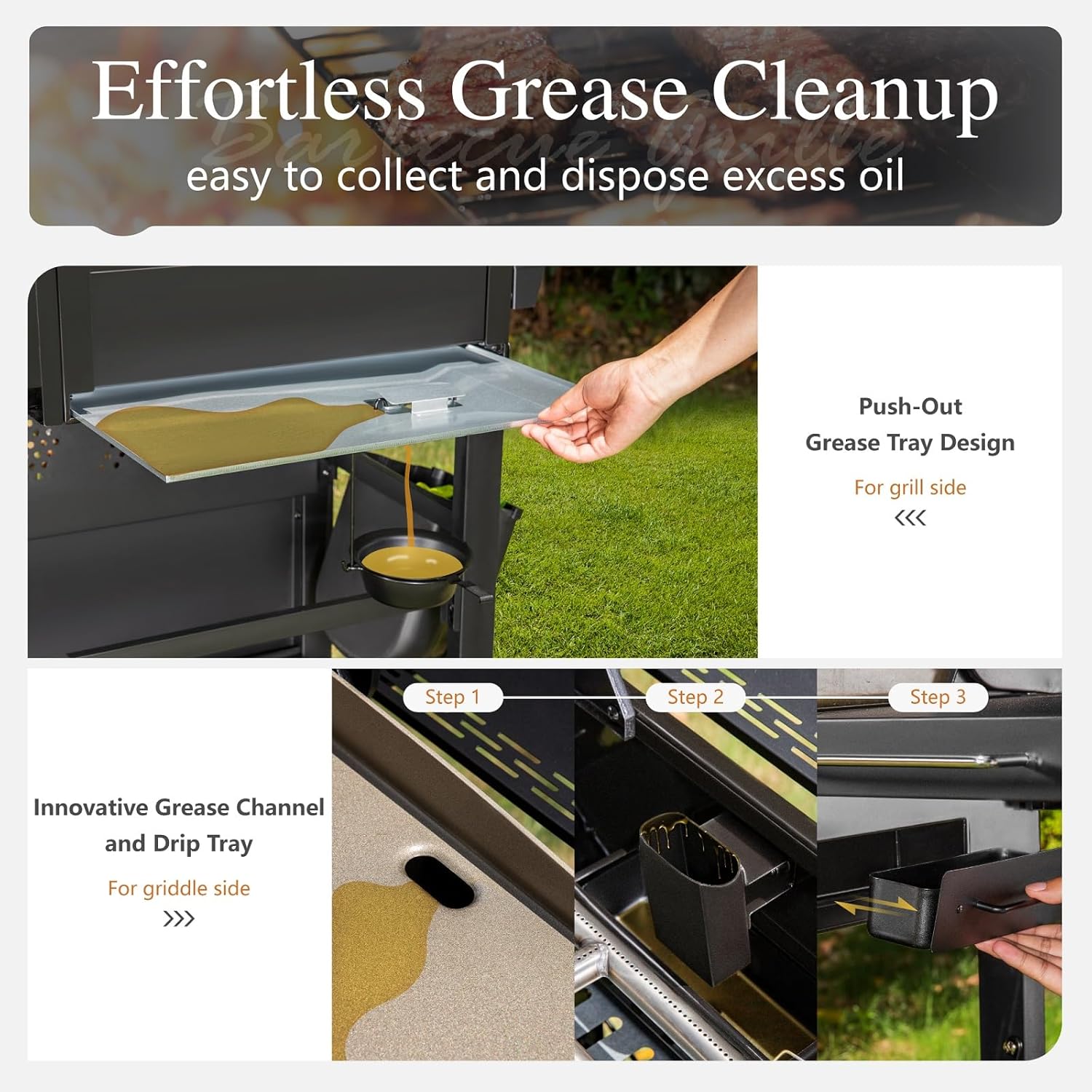 - 【Easy to Clean】The flat top griddle part comes with a handy drawer-style grease box that effortlessly collects drippings, making cleanup a breeze. While the gas grill part, there's a pull-out grease tray along with a grease cup underneath, offering extra peace of mind by catching any excess grease. These practical features make it easier to keep grill clean, so you can focus on enjoying your cookouts with family and friends