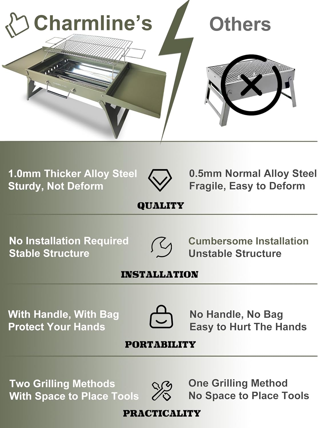 - Durable and Long-Lasting: Our grill made from thickened alloy steel. It can offers greater strength and a longer lifespan. Caution! To extend the lifespan of the grill, please keep the amount of charcoal below half of the charcoal tray.