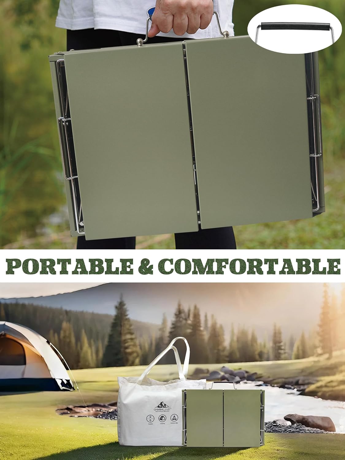 Charmline 20x14inch Big Desktop Charcoal Grill, Liftable Grilling Net, Saving Space Grill for Indoor and Outdoor, BBQ Grill for Camping, Gardens, Picnics, Beach Parties, Green, Max