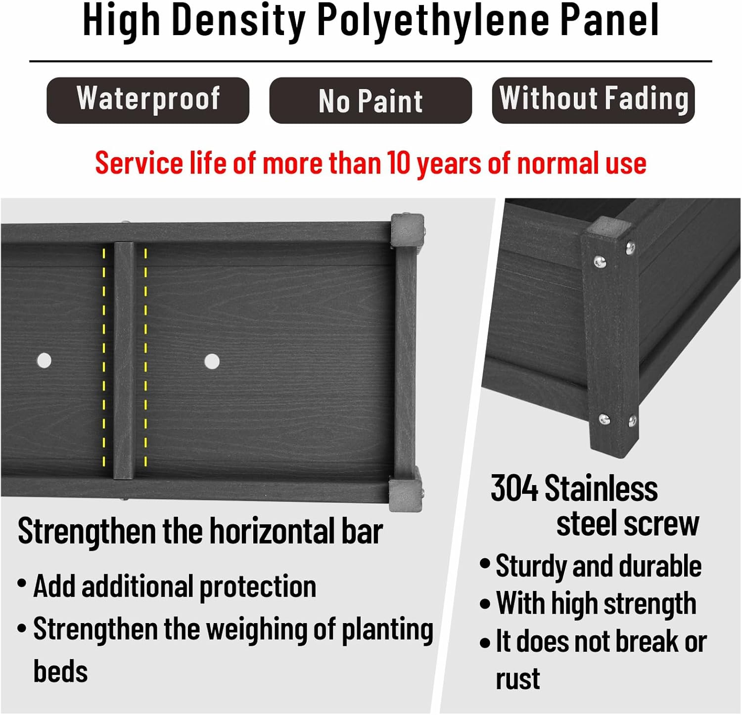 - Safety:Raised planter box outdoor made from HDPE,with no water or oil-based coatings, ensuring that your fruits, vegetables, plants, and herbs grow safely
