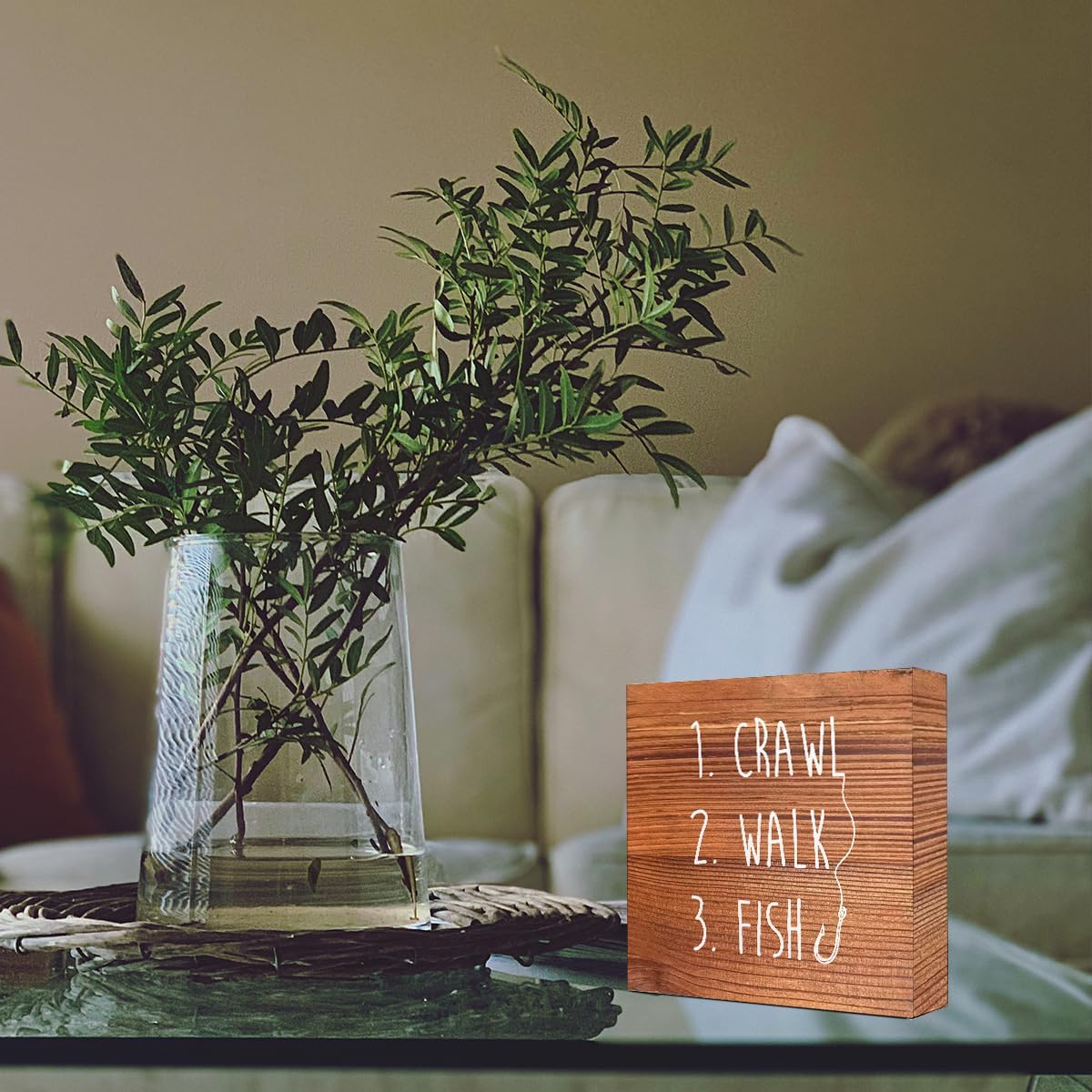 Brown Country Crawl Walk Fish Rustic Wooden Sign Desk Decor,Funny Baby Fishing Wood Block Sign Desk Decorations for Home Bedroom Baby Room Shelf Table Decor