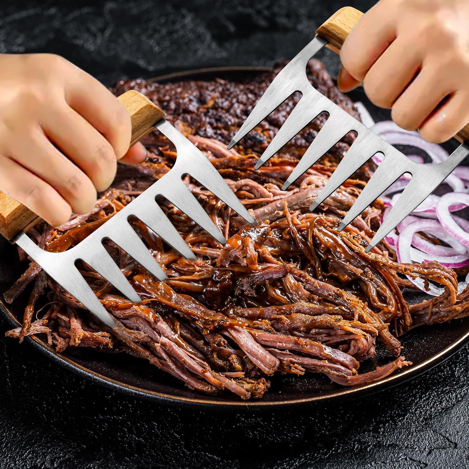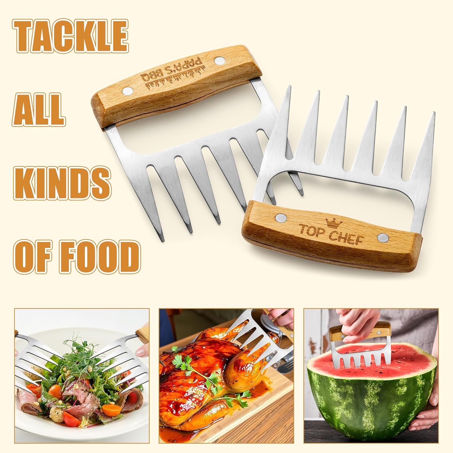 - Premium Quality & Durable Design:Made from high-quality 430 stainless steel, our shredder claws are heat resistant up to 500°F and won't bend, ensuring they're ready for all your holiday cooking needs. The Anti-Slip wooden handles, ergonomically designed for comfort, provide a solid grip even when handling hot items. The durable, rust-resistant construction and heat-resistant material ensure long-lasting performance, guaranteeing years of reliable use.durable BBQ tools, heat-resistant.