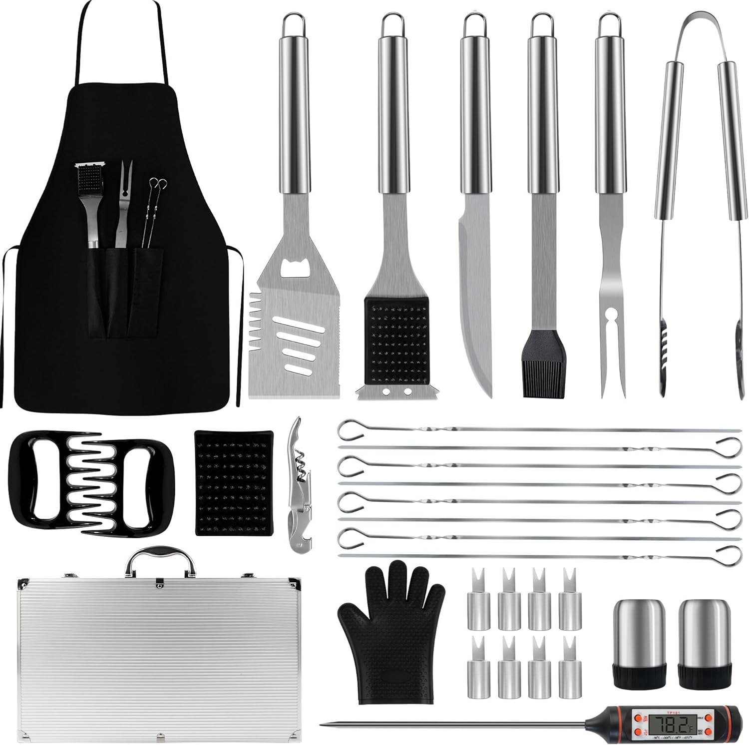 - COMPLETE GRILLING ACCESSORIES: Our 32-Piece BBQ Tool Set includes essential grill accessories like apron, tongs, basting brush, 4-in-1 spatula, cleaning brush, fork, knife, meat thermometer, heat-resistant gloves, bottle opener, salt and pepper shakers, meat claws, corn holders, and skewers—all neatly packed in a handy carrying case, ensuring you're fully equipped for backyard barbecues or camping trips