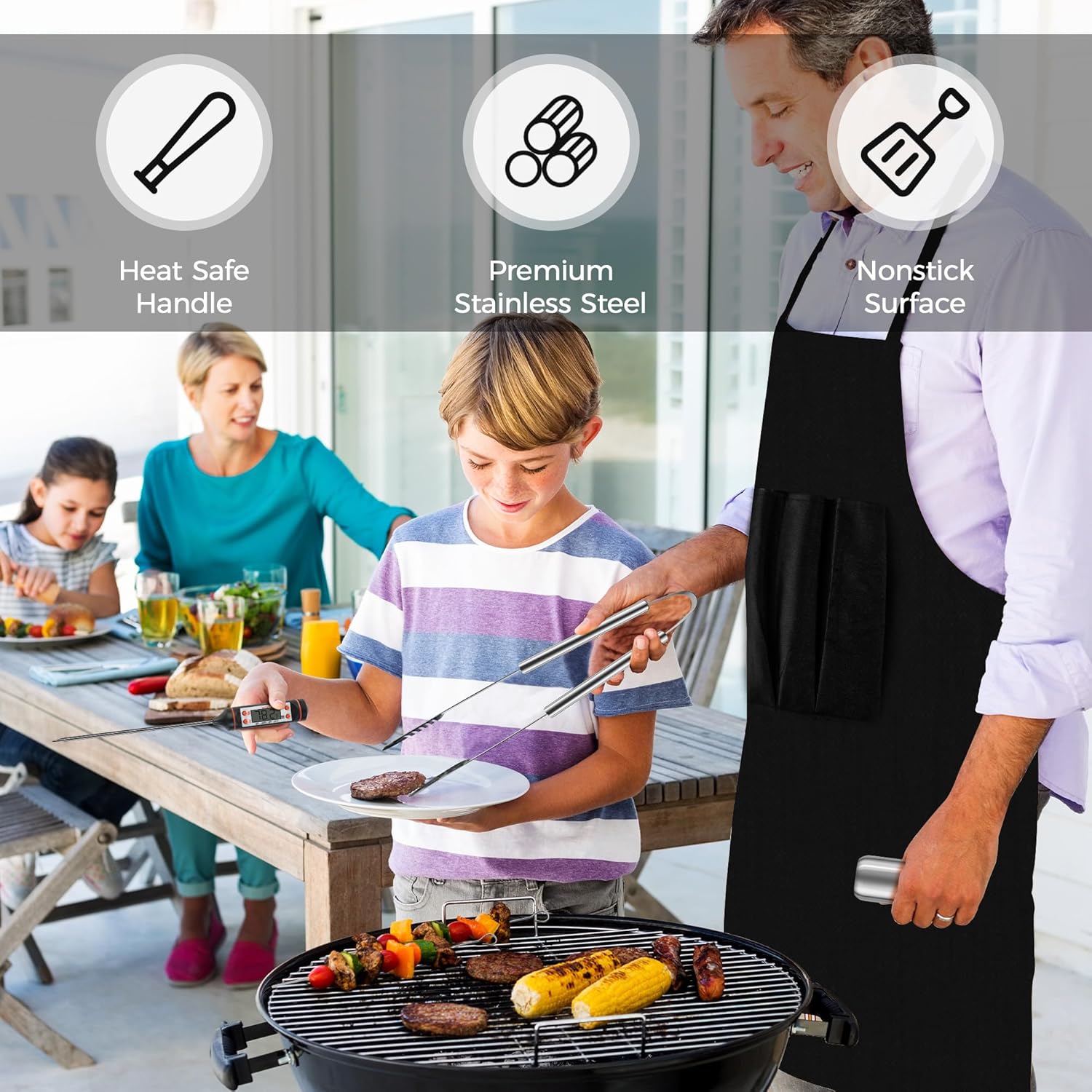 - Included Components : 4-in-1 Spatula, Meat Thermometer, Carry Case, Apron, Tongs, Basting Brush, Fork, Knife, Heat Protective Glove, Bottle Opener, Grill Cleaning Brush, Replacement Head of Cleaning Brush, Salt&Pepper Shakers, Meat Claws, Corn Holders, Kabob Skewers 4-in-1 Spatula, Meat Thermometer, Carry Case, Apron, Tongs, Basting Brush, Fork, Knife, Heat Protective Glove, Bottle Opener, Grill Cleaning Brush, Replacement Head o… See more