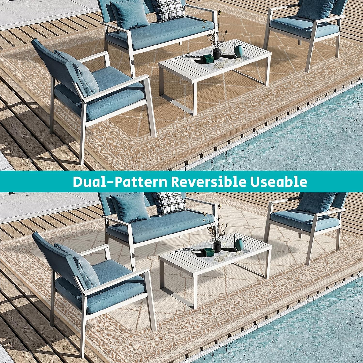 - Reversible Outdoor Rugs: Featuring a classic moroccan pattern on both sides, this 8x10 ft outdoor area rug allows you to instantly refresh your patio, porch, backyard, deck, RV campsite. And this outdoor deck rug is reversible, two-sided design allows you to have two different looks,both sides can blend perfectly with nature and look very full and comfortable.
