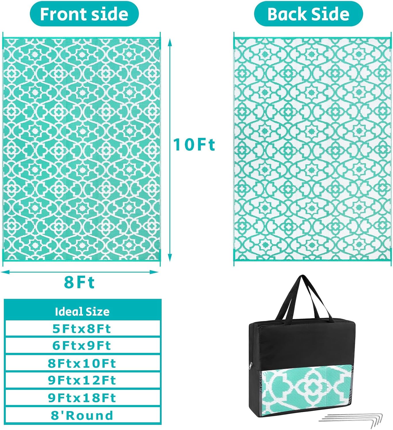 • XXL Large Reversible Outdoor Rugs: Featuring a classic moroccan pattern on both sides, this rectangular 8x10 ft outdoor area rug allows you to instantly refresh your patio, porch, backyard, deck, RV campsite. And this outdoor deck rug is reversible, two-sided design allows you to have two different looks,both sides can blend perfectly with nature and look very full and comfortable.