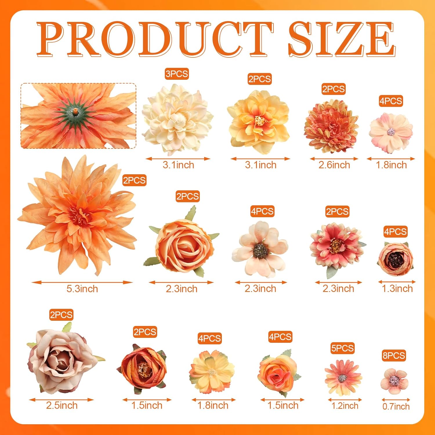 - You will get a pack of 50 fake flower heads, included 15 flower styles, roses, mini daisies, peony,dahlia,chrysanthemum,orchids, hydrangea and hibiscus. These artificial flower heads are made of high-quality silk and fabric,