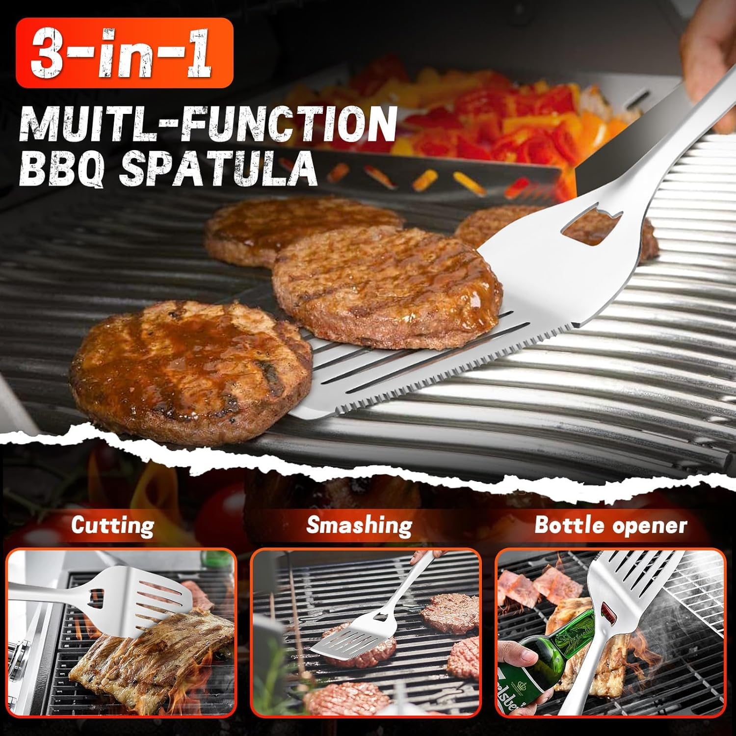 - 3-in-1 Grill Spatula: Slice steaks, pop bottle caps, and flip patties with one rugged, rust-resistant stainless steel tool. Engineered for saving time and space, the PURPLEBIRD grilling tools set helps you enjoy outdoor tailgates and cozy weeknight dinners with flawless grilling