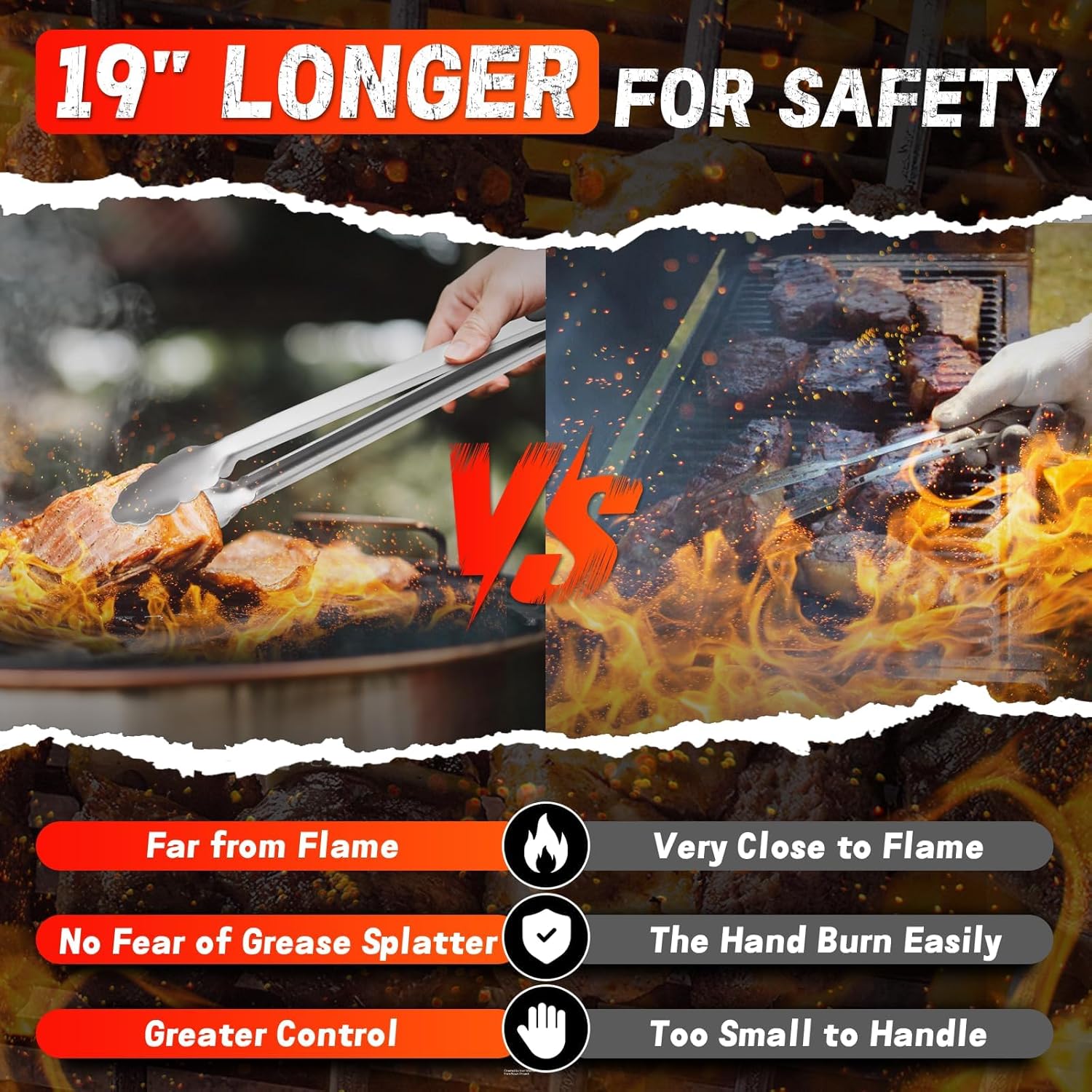 - Heat Safe Design: Extra-long 19" stainless steel BBQ grill tools keep hands safe from heat. Silicone grips stay cool and comfy for long BBQs. No more burns or dropped food—enjoy flawless BBQ every time