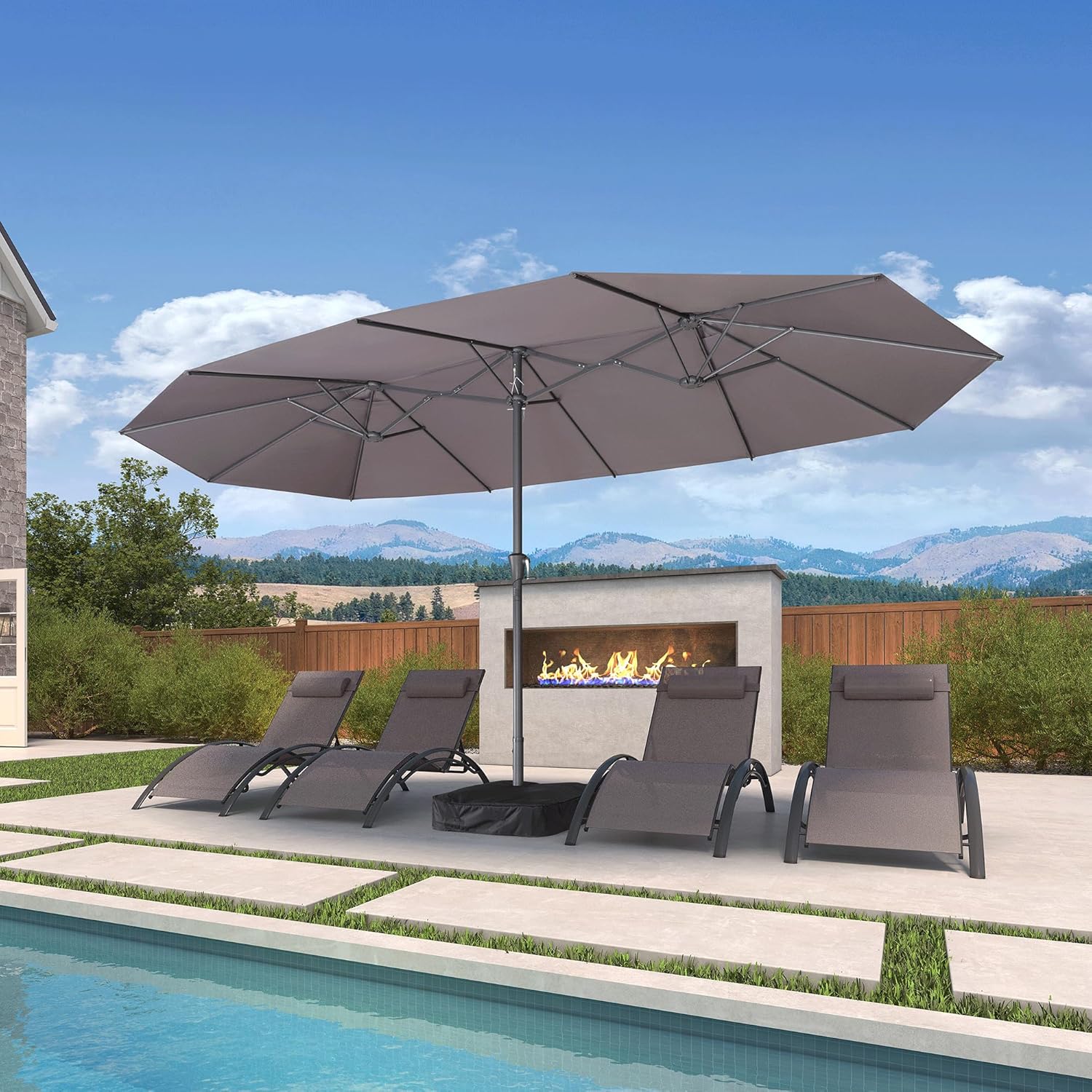 - Double-Sided Umbrella: This market patio umbrella provides up to 15 feet of coverage, offering shade for at least an 8-piece dining set. It is ideal for use in spacious patios, gardens, or by the poolside