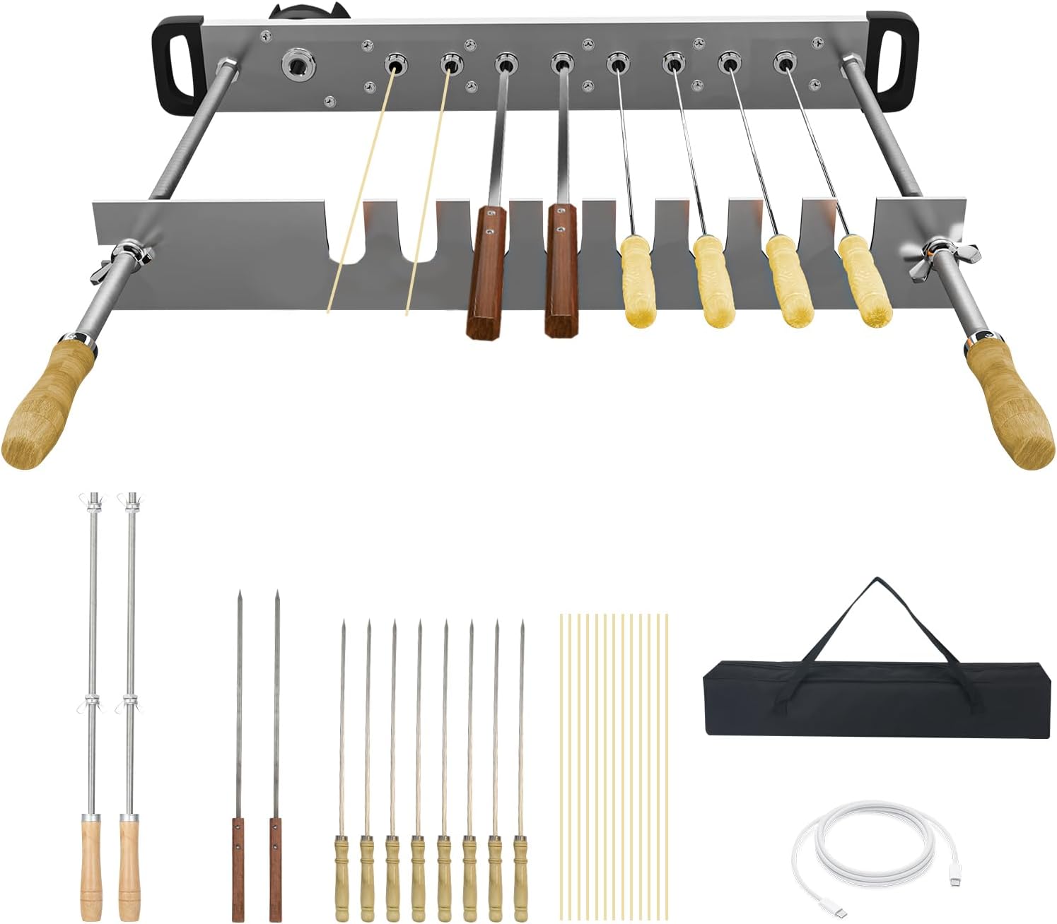 - 1、Widely used: The automatic rotary barbecue grill is designed with adjustable width, which is simple and fast to install. The width can be adjusted to 20 inches at most according to your own needs. and the length can be purchased according to the size. There are two models on sale: G500 and G700. G500 has 8 holes and can bake 8 skewers at the same time. It is equipped with 2 large stainless steel skewers, 8 small stainless steel skewers and 20 bamboo skewers. Suitable for all kinds of open barbecue grills.