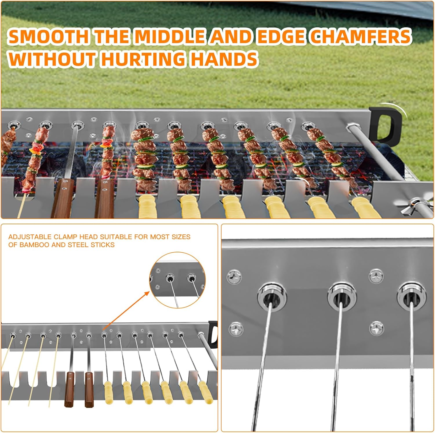 - (Warm Tip): In the actual use process, when wearing food, don't wear all the skewers. It is best to reserve a space of more than 3CM. It is convenient for the chuck to clamp the kebab and prevent the food from touching the barbecue equipment when it is too full.