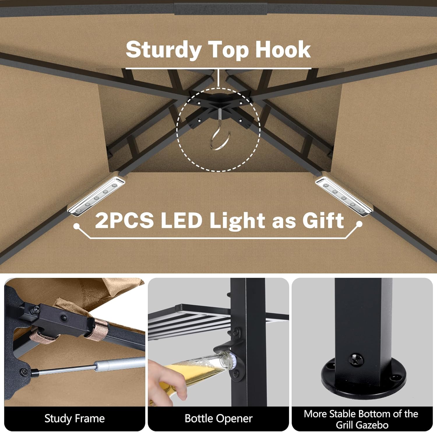 MASTERCANOPY 11 x 5 Grill Gazebo with Extra Side Awning Outdoor BBQ Gazebo with 2 LED Lights for Patio Party Backyard Picnic(Khaki)