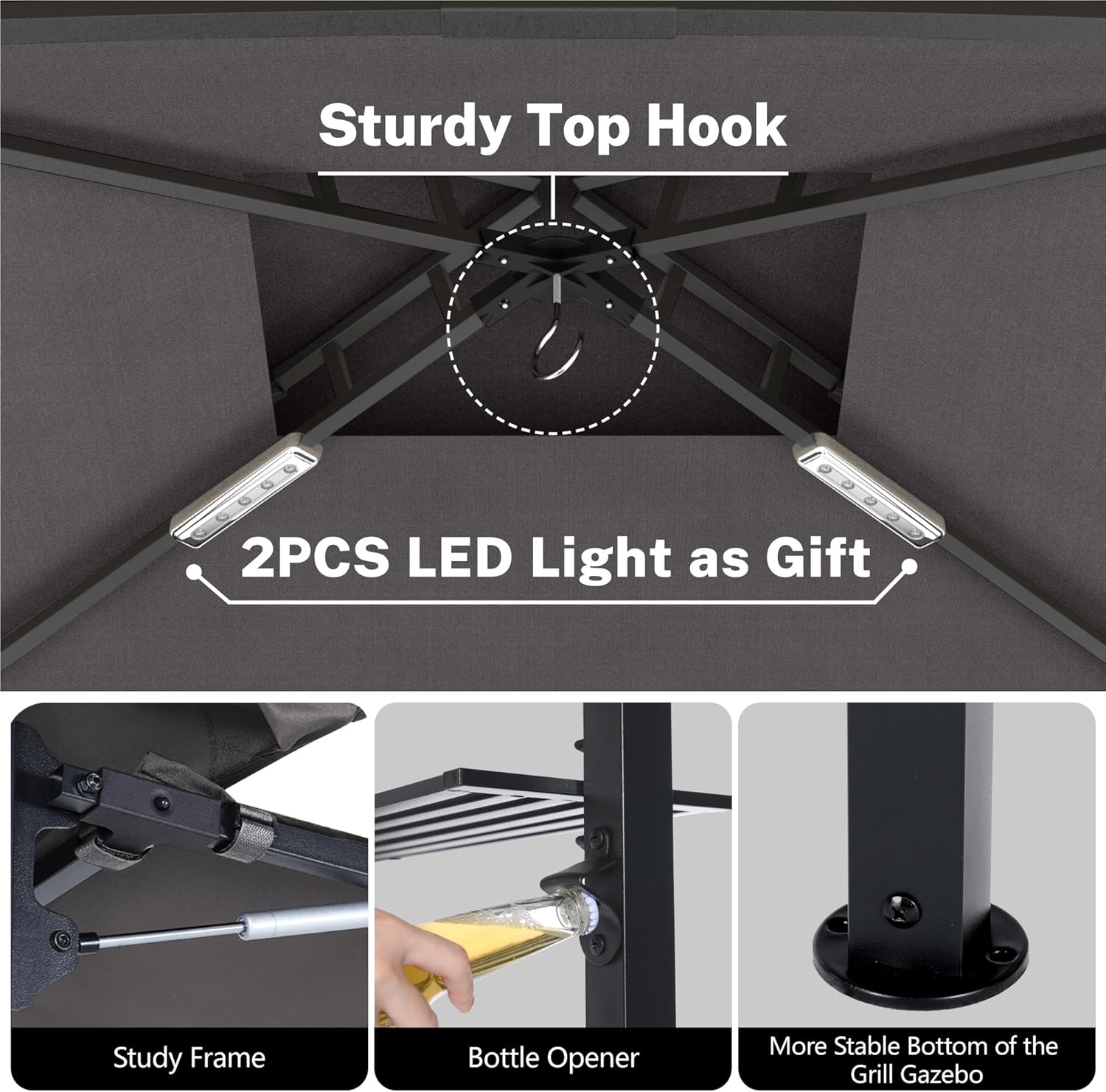 - ✅Extra Side Awning:The new upgraded grill gazebo adds an extra awning, the extra awning can increase the grilling space as well as shade the food to keep it fresh, it also provides better rain protection for people and food.