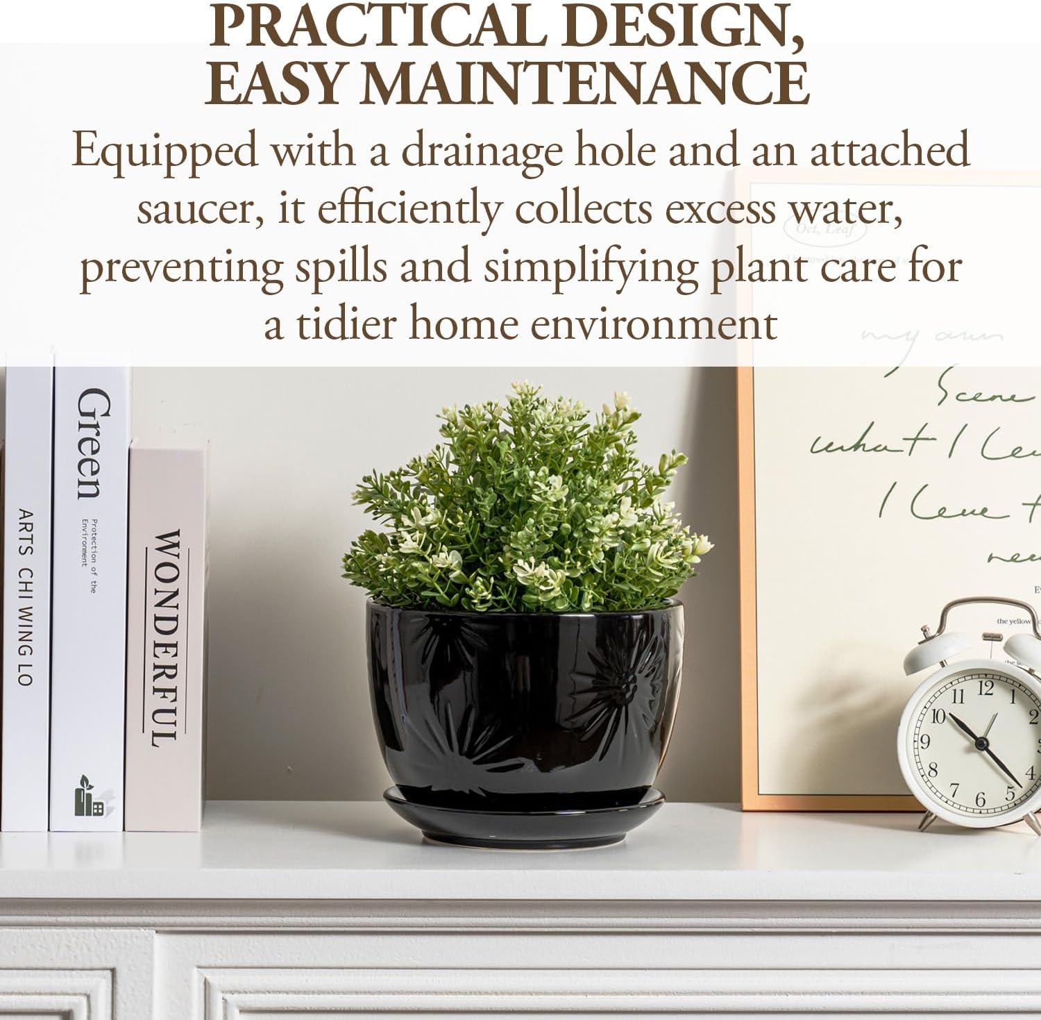 - Attached saucer helps catch excess water and protects sensitive surfaces from water damage
