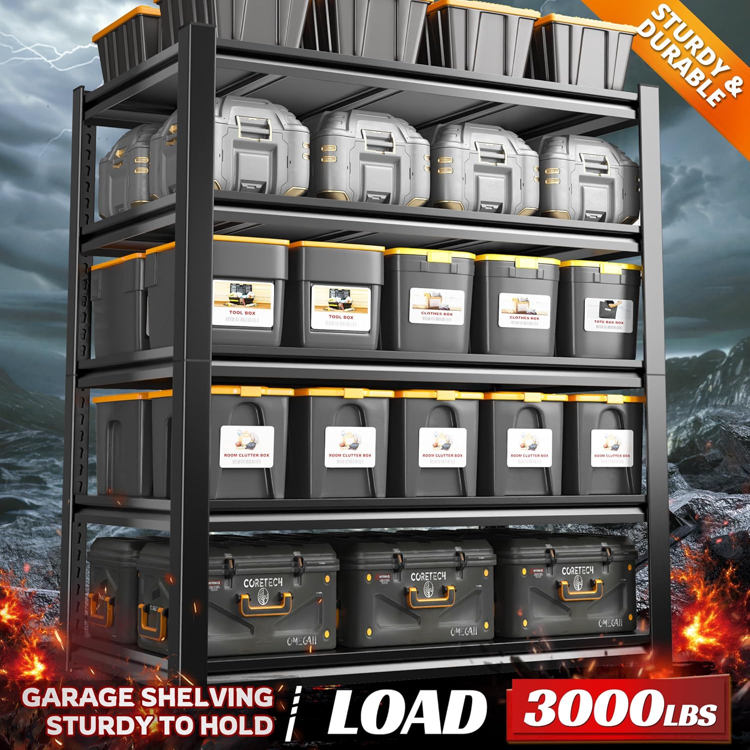 - 【3000LBS Capacity Sturdy & Storage Shelves】 Upgraded REIBII garage shelving heavy duty has thickened double metal legs.Shelving is made of high-quality metal steel brackets and strengthened 3* ribs underneath each shelf compartment, which can easily hold up to 600 pounds, sturdy and stable than ordinary garage storage shelves,with a total bearing capacity of 3000 lbs