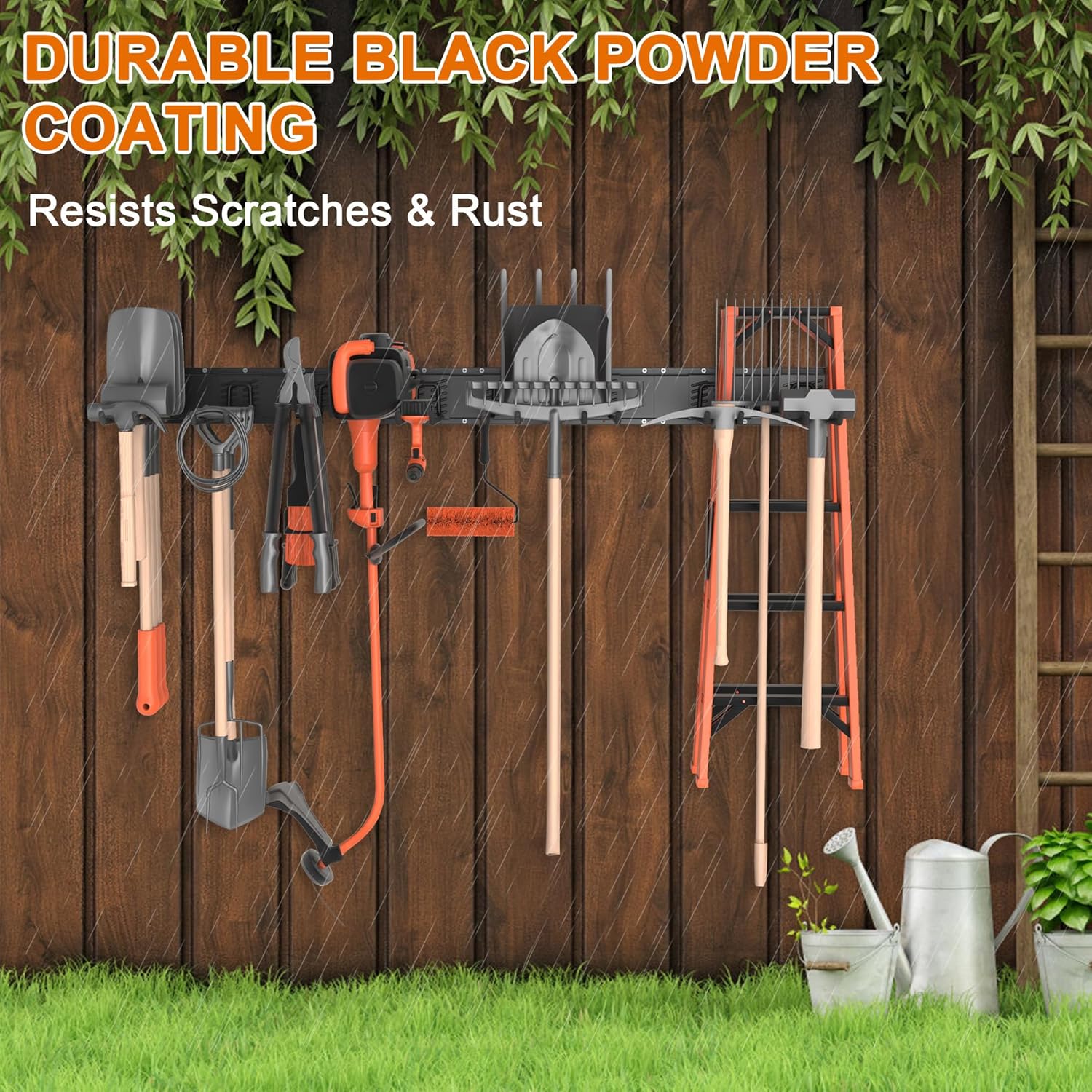 - [Multi-functional Tool Rack]: This tool storage rack is not limited to tools, but can also accommodate items such as brooms, hoses, yard tools, sports equipment, etc; Whether in the garage, yard, garden, basement, tool shed, gym, home, etc; The wall mount tool organizer provides a viable solution