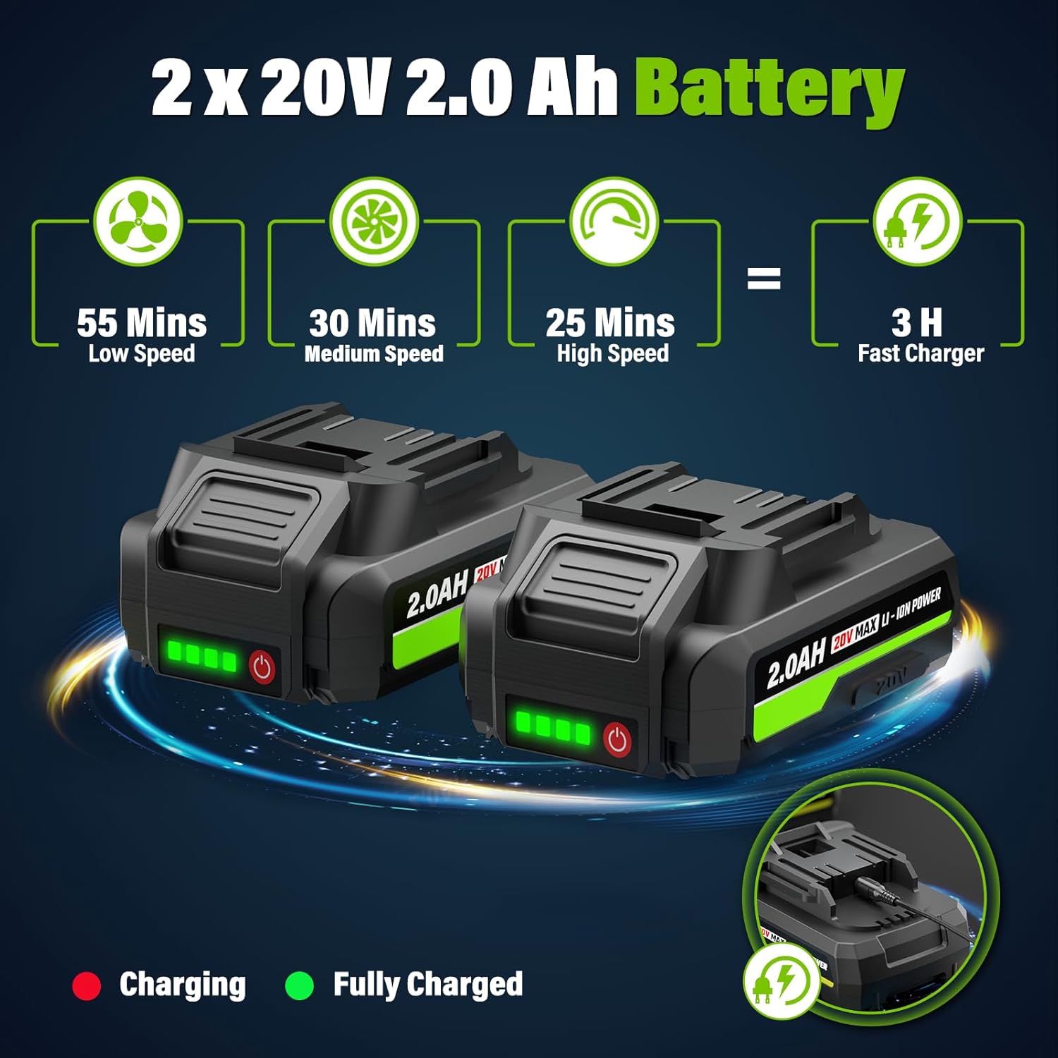 - 2 X 2.0 Ah Battery: SEYVUM cordless leaf blower comes with 2 pcs lithium-ion battery and 1.3A fast charger; Up to 25 mins runtime with the high speed, and 55 mins with the low speed. Please make sure the battery is cool before charging