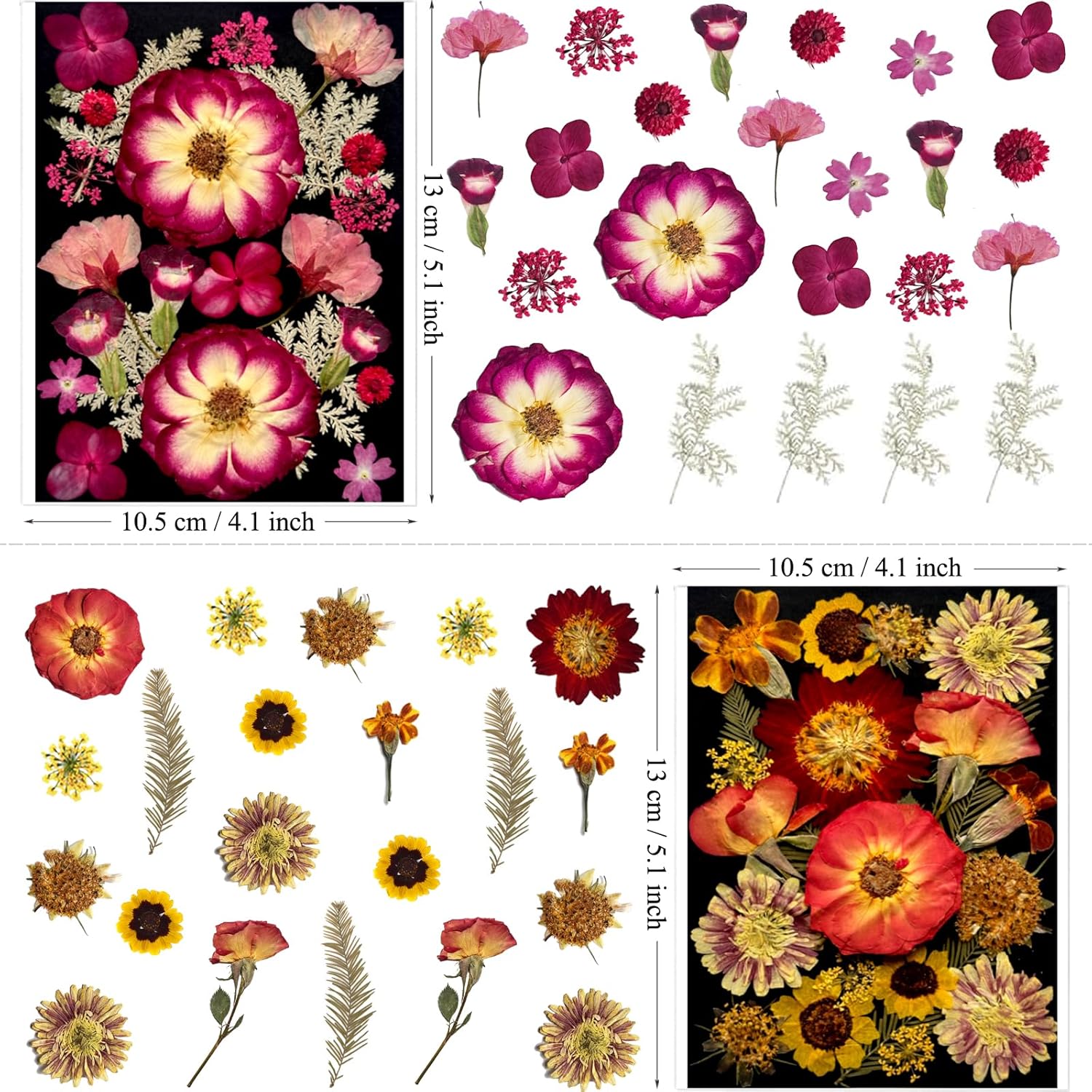 - Vacuum Package: These pressed dried flowers are transparent vacuum packaged, to protect the flowers with safe shipping, retain their vibrant colors and shapes. You will receive 4 packs of dried flowers in independent packaging, contains 92 pcs different kinds of flowers and leaves.