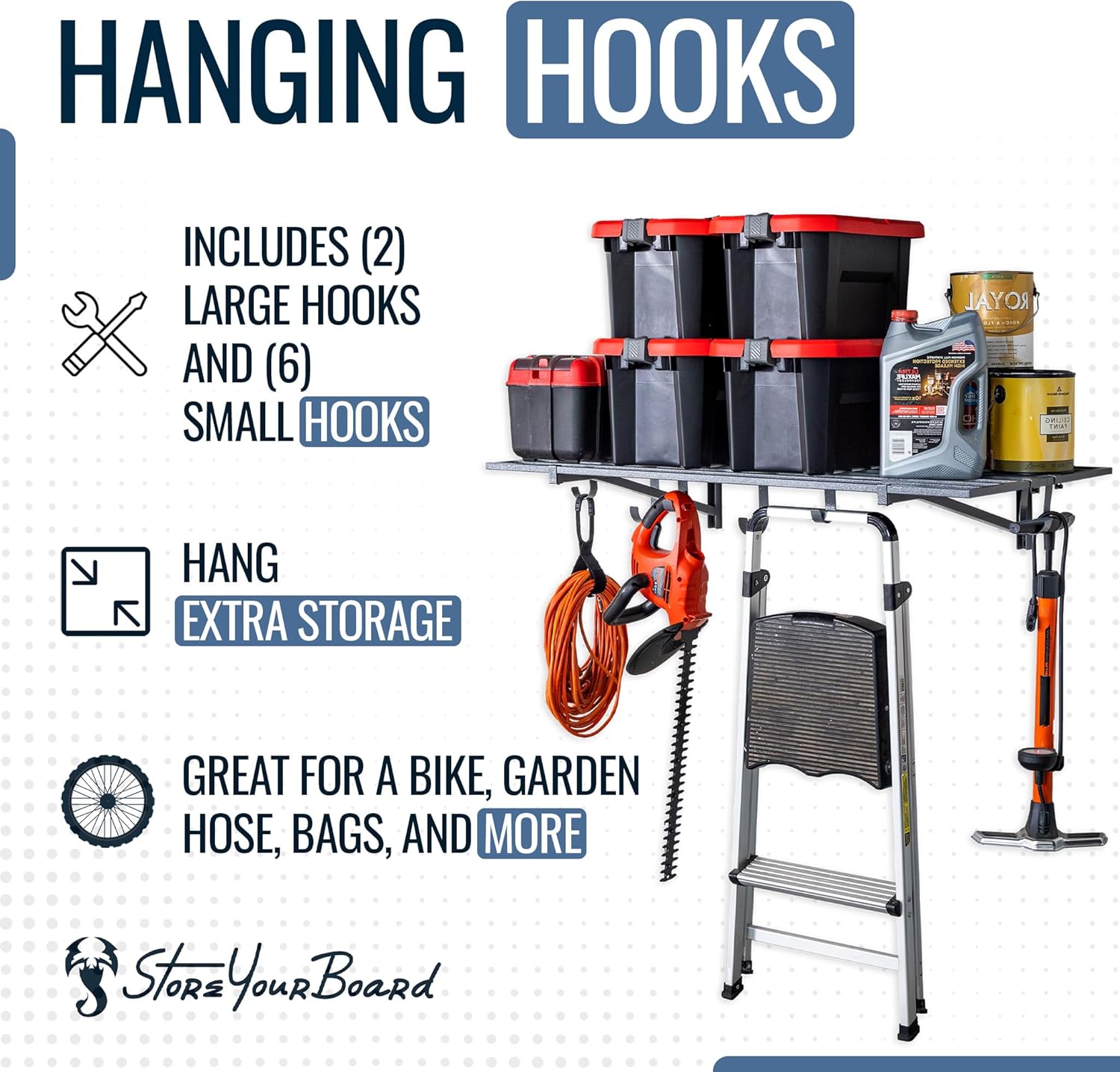 - INCLUDES STORAGE HOOKS – Comes with 2 large and 4 small garage hooks for added hanging storage under each wire shelf. Use the hooks for cords, garden tools, bags, or garage wall organizer systems. Maximize vertical space while keeping frequently used tools within reach.