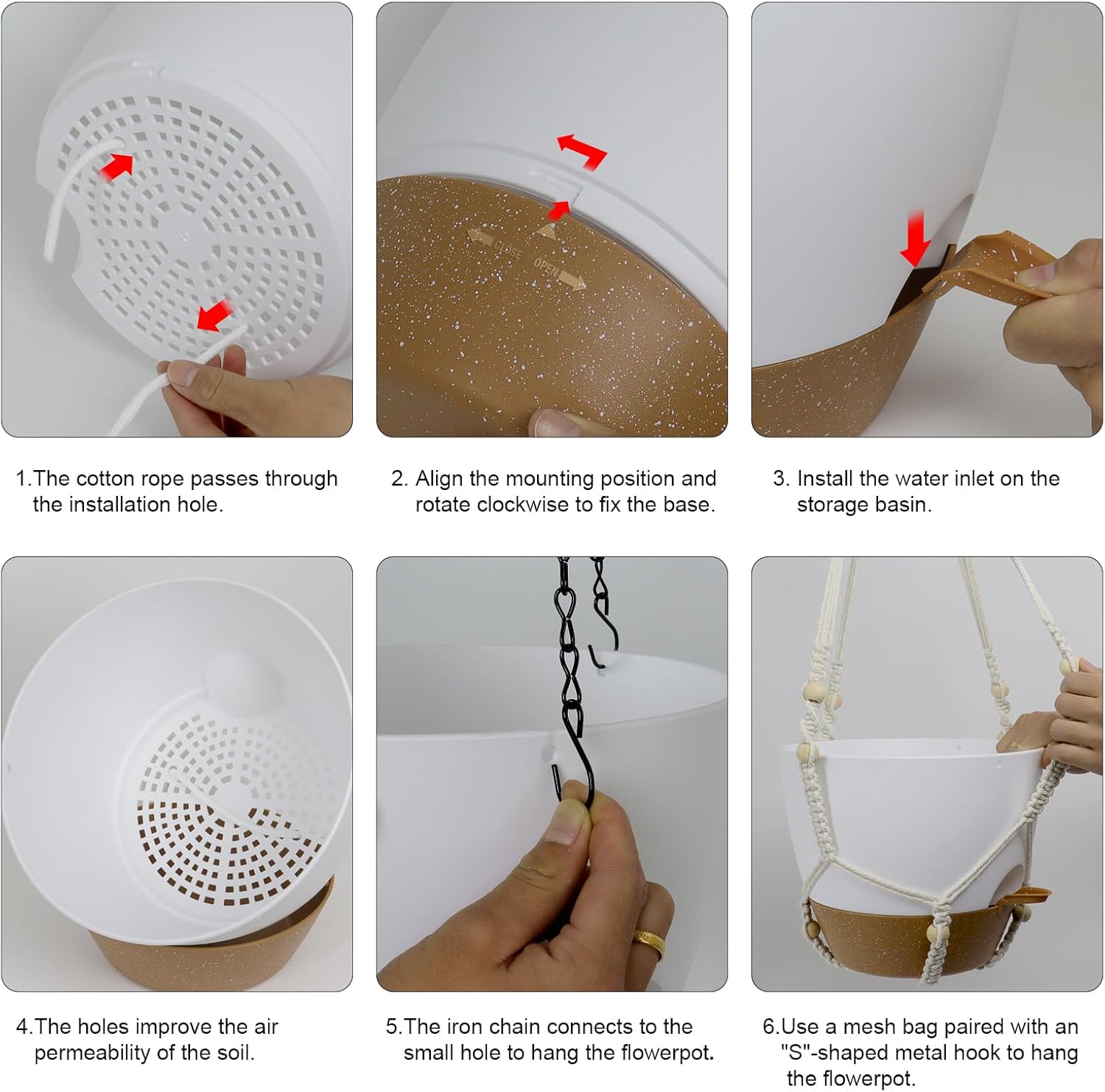 - 【Self-Watering Hanging Planter with Removable Tray】This hanging flower pot comes with a detachable bottom tray that acts as a water reservoir, holding a good amount of water. When your plant needs water, it’s absorbed through cotton wicks from the reservoir to the soil, reducing how often you need to water