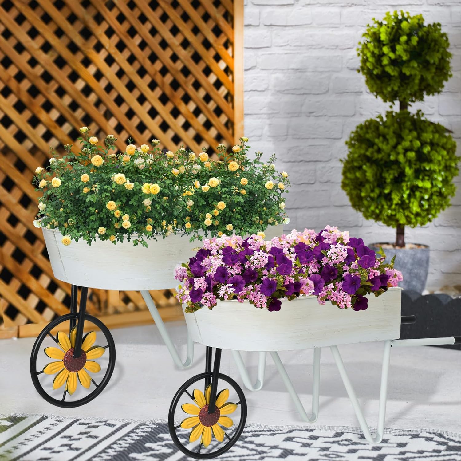 - Wheelbarrow Planters: Each vintage planter features a wheelbarrow design with distressed finish. Two handles and a non-rolling wheel with flower spokes are pretty and keep it securely in place. Add a fun addition to your home's outdoor area with them