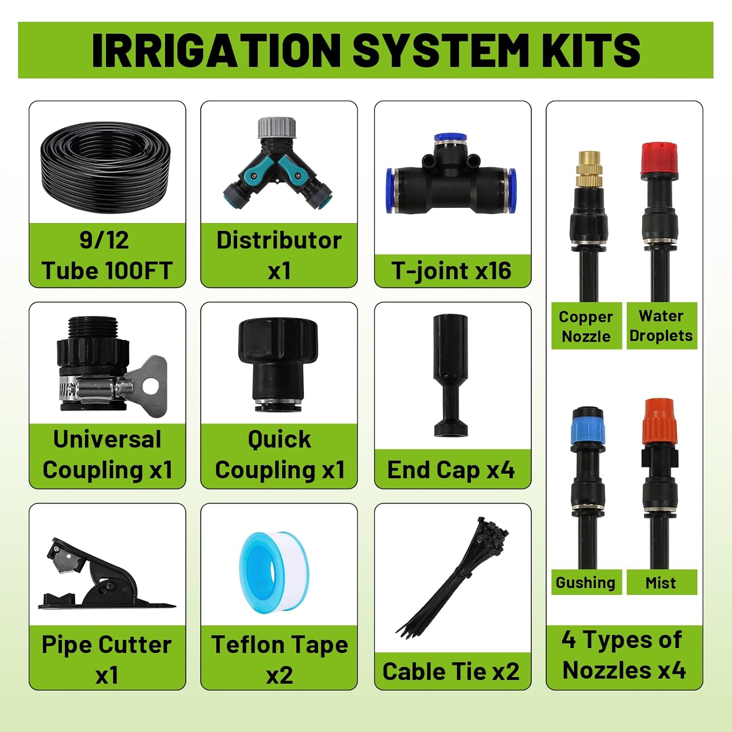 Drip Irrigation Kit - 100 FT. Hose Sprinkler System with 360° nozzles and T-connectors for Gardens, lawns, Plants, Flower beds, Trees, patios and hydroponics (16 360° nozzles + 16 T-connectors)