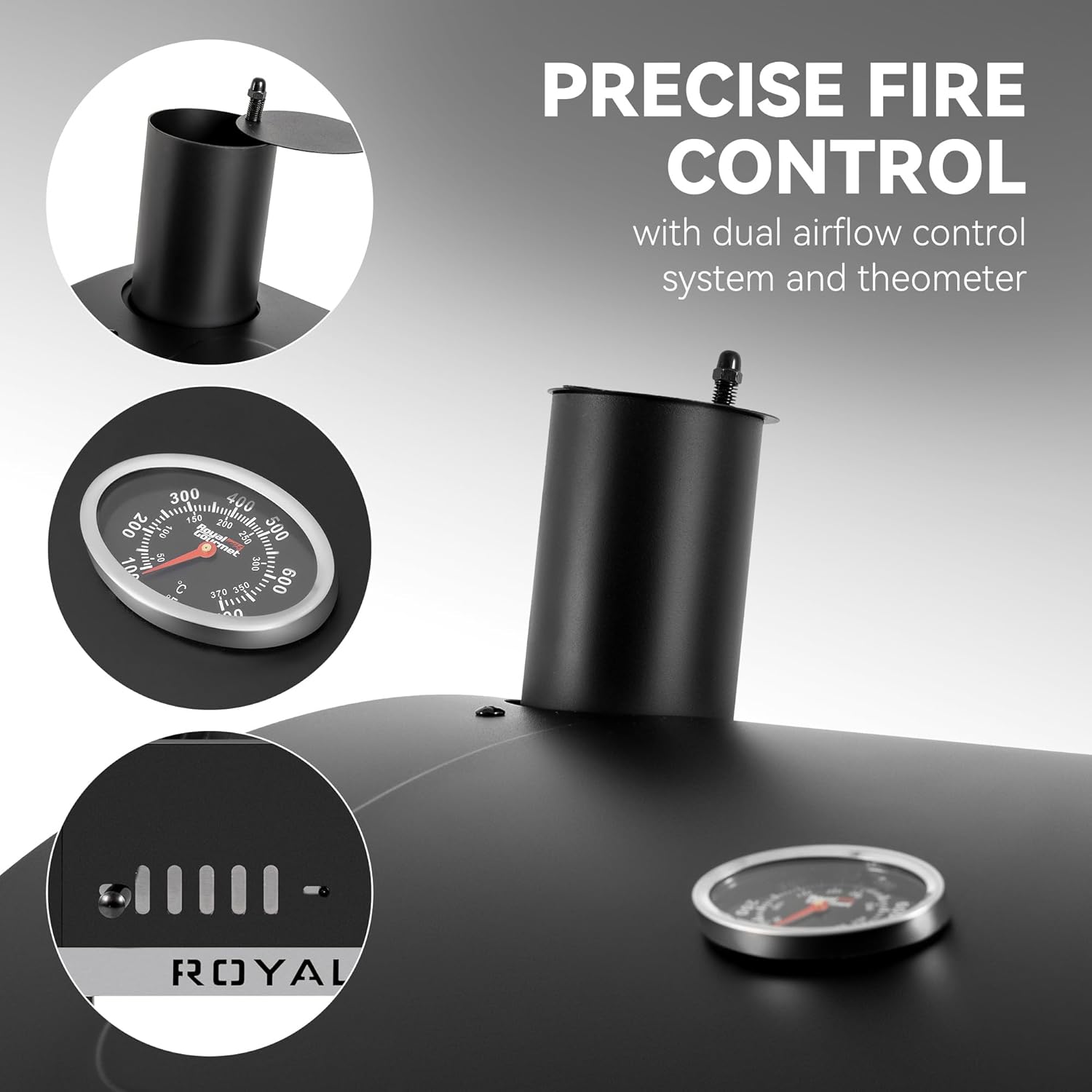 - Professional Temperature Control: A lid-mounted stainless steel thermometer monitors temperature precisely in real-time, while 2-level height-adjustable charcoal pan, two adjustable air vents and a stack allow for exceptional temperature control