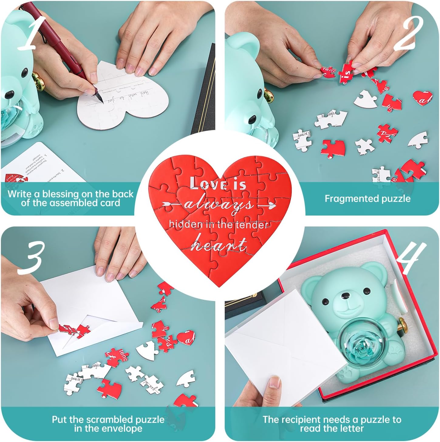 - π§© Uniquely Designed Love Puzzle: This special love puzzle allows you to write a heartfelt message on the back. Break up the puzzle and place it in an envelope. For your special someone to understand your feelings, they must piece the puzzle together, revealing your message of love.