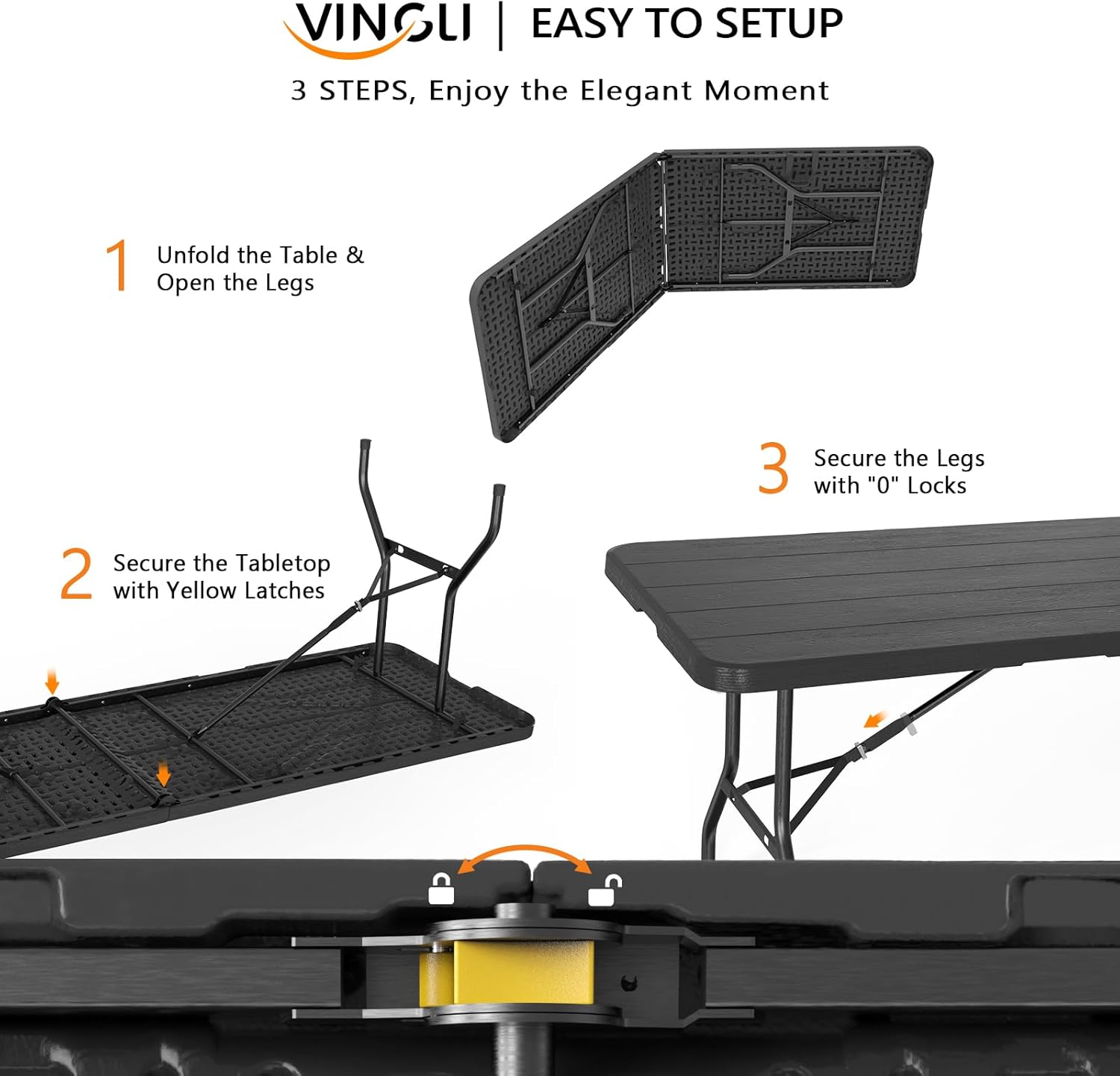 VINGLI 8 Foot Plastic Folding Table Portable Long Table for Indoor Outdoor Use Rectangular with Carrying Handle, Black