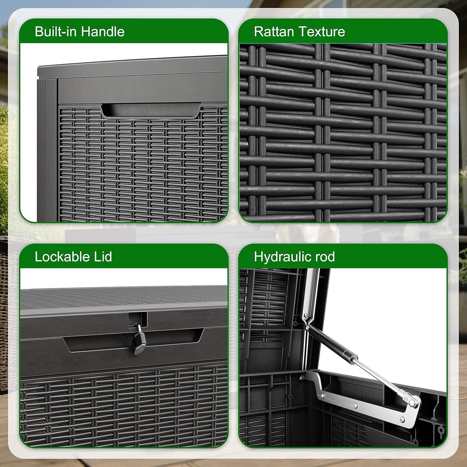 - EASY TO USE: The deck storage box is designed for convenience with built-in handles on both sides, allowing easy lifting and movement. Plus, for added security, you can install a password lock/small lock (not included) on the top cover