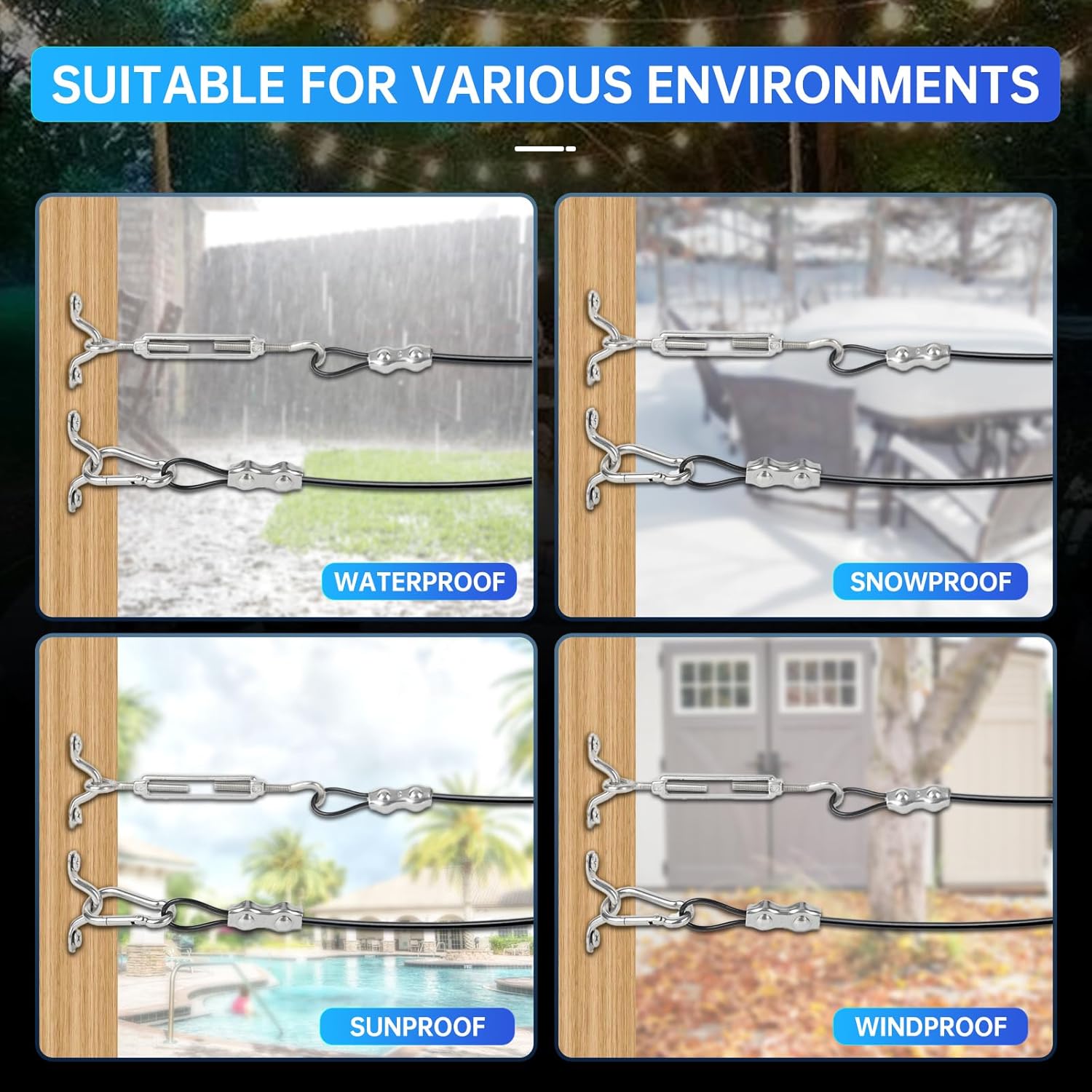 - Easy to Install :Guide Wire for Outdoor String Lights Each Part is Threaded, and Our Wire Rope Kit Includes Simple Tools to Assist in the Installation, to Better Secure All the Accessories, Easy to Assemble or Disassemble, Reusable. The Double Rope Clips Inside Our Steel Cable Kit Hold the Wire Rope more Securely than Single Rope Clips, and The M5 Turnbuckle are Adjustable in Length, Allowing You to Easily Install the String Lights on Wood, Timber or Concrete Walls.